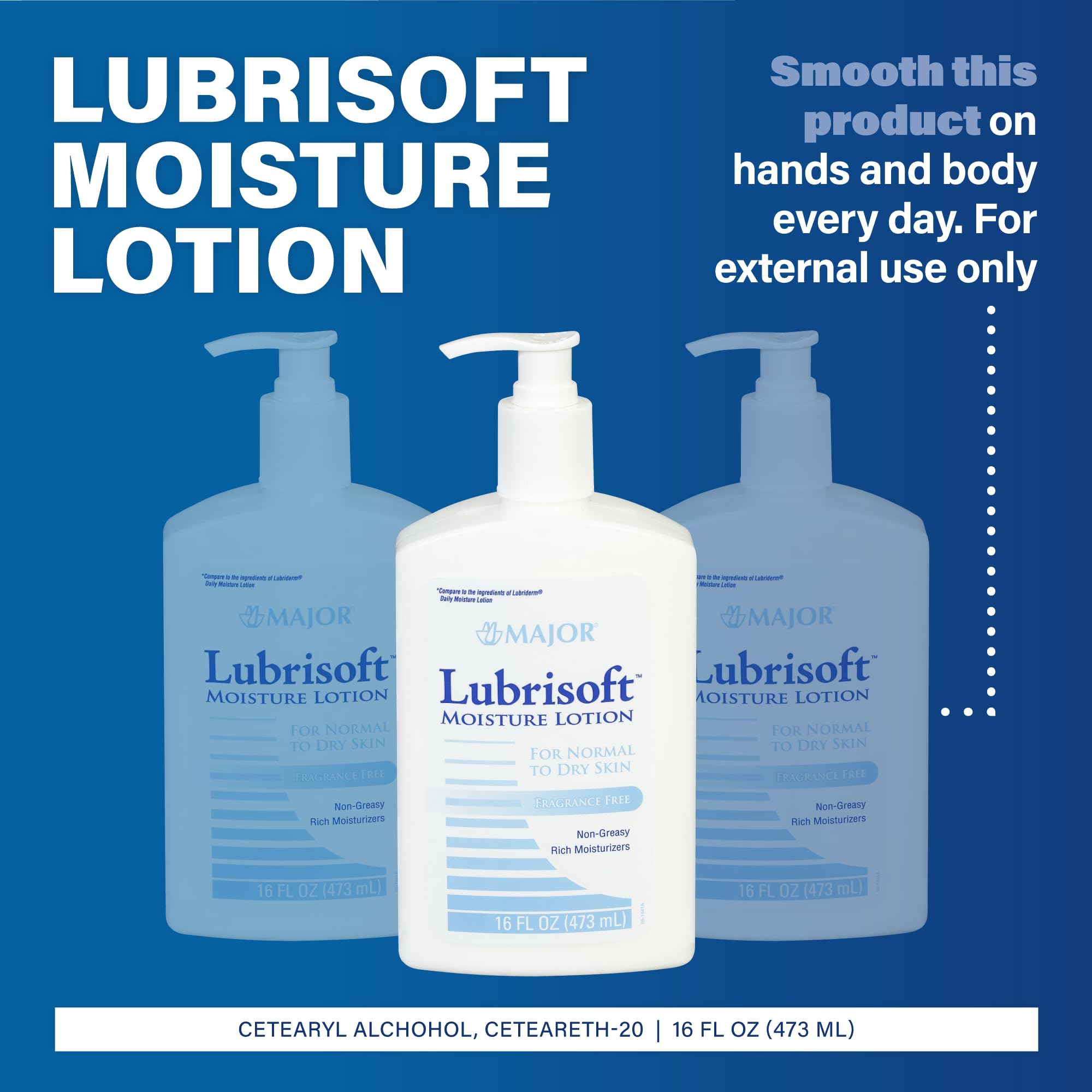 Major Lubrisoft Moisture Lotion’s nourishing, rich, and creamy formulation moisturizes dry skin without dyes or fragrance. The combination of nutrient-enriched moisturizers absorbs into dry skin, leaving skin feeling softer, smoother, and more comfortable. It is formulated for normal to dry skin. To use, smooth this product on your hands and body every day. For external use only.