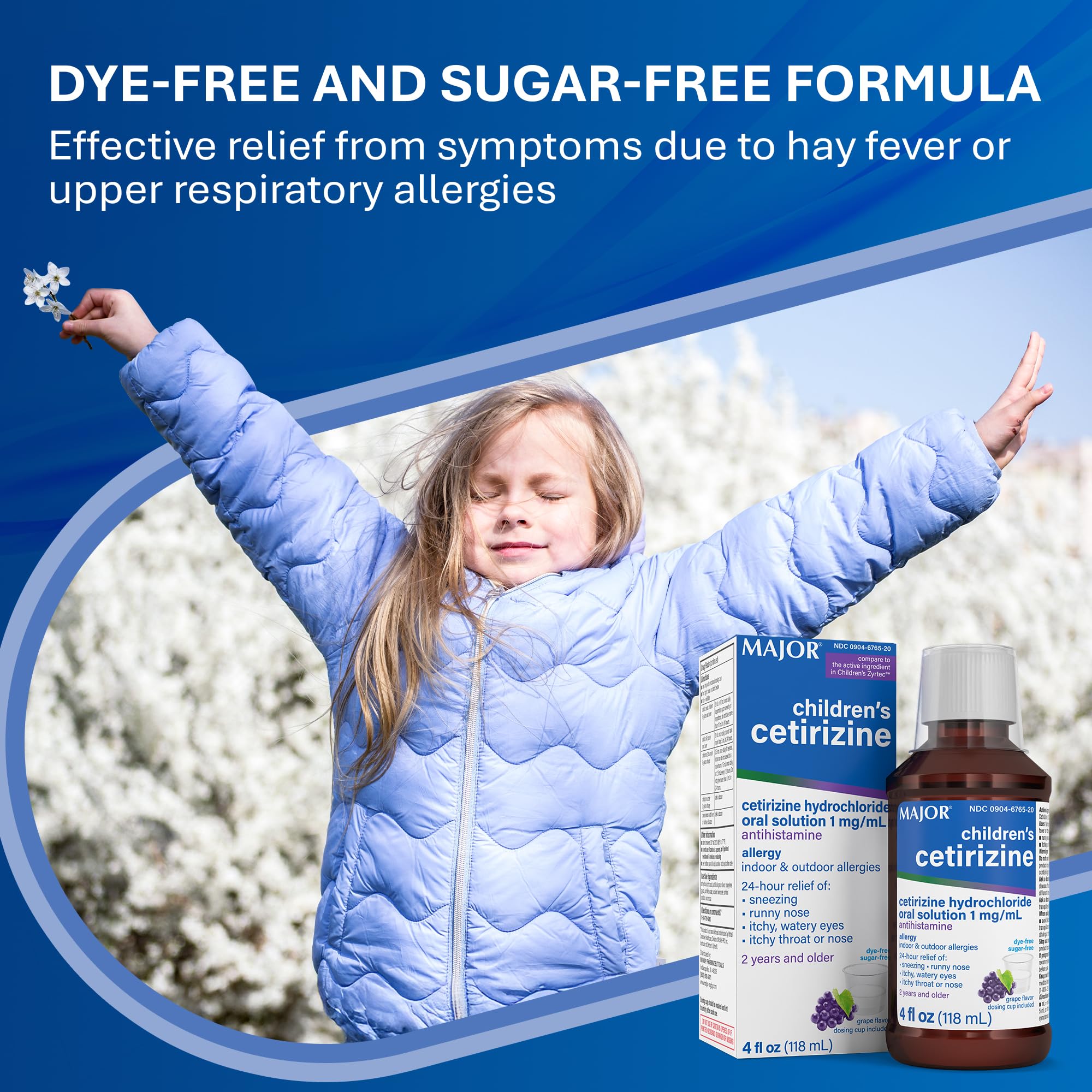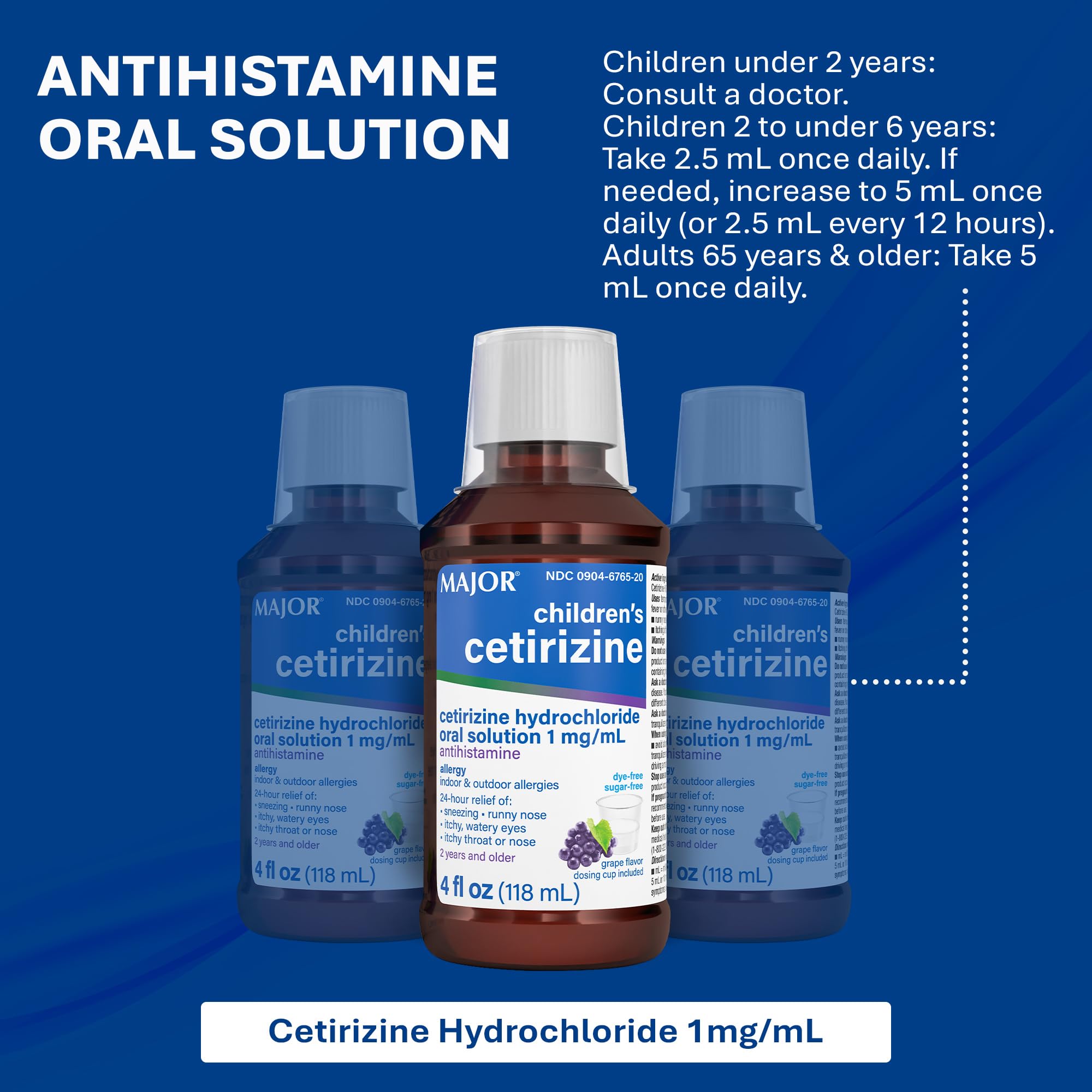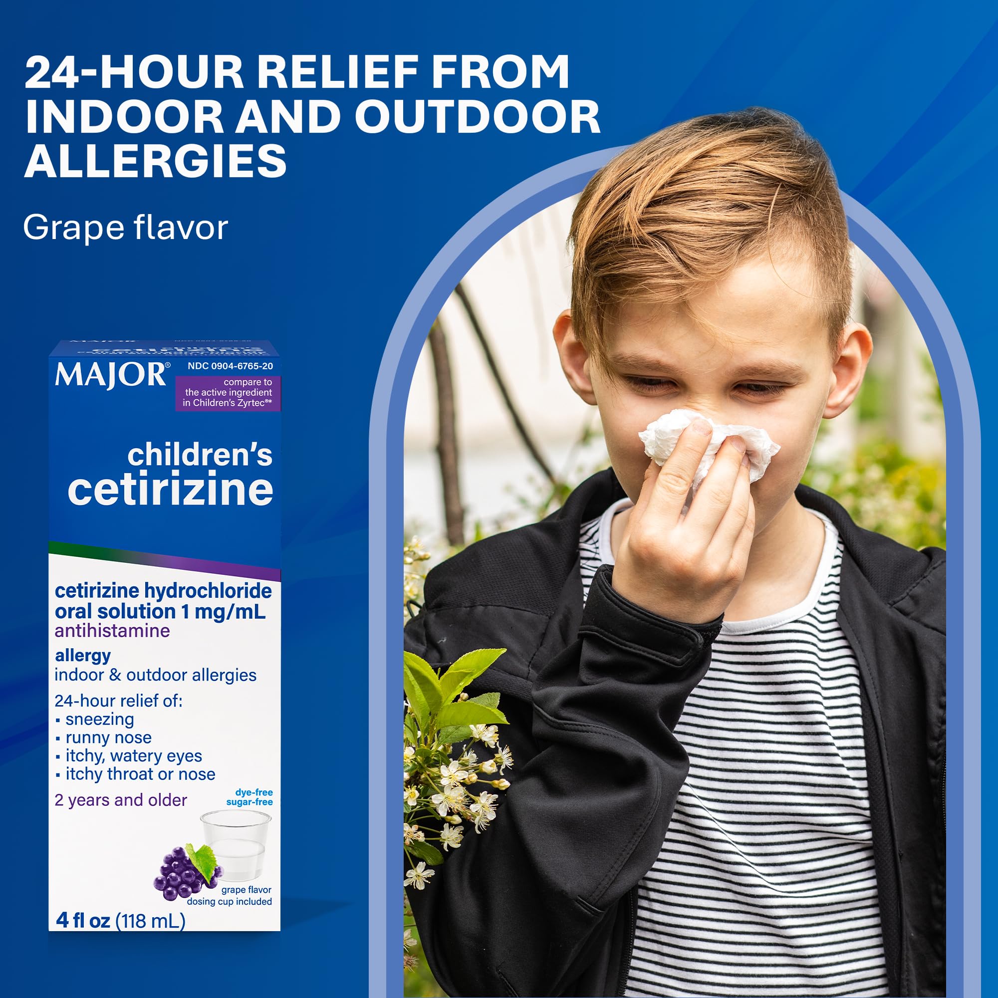 Major Children's Cetirizine 5 mg Antihistamine, Grape-Flavored Allergy Relief Liquid for Sneezing, Runny Nose, Itchy Watery Eyes & Itchy Throat, 24-Hour Indoor & Outdoor Relief - 4 Fl Oz (1 Pack)