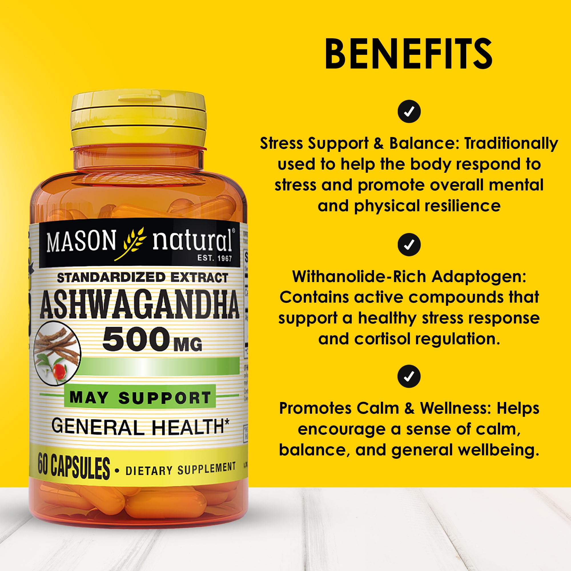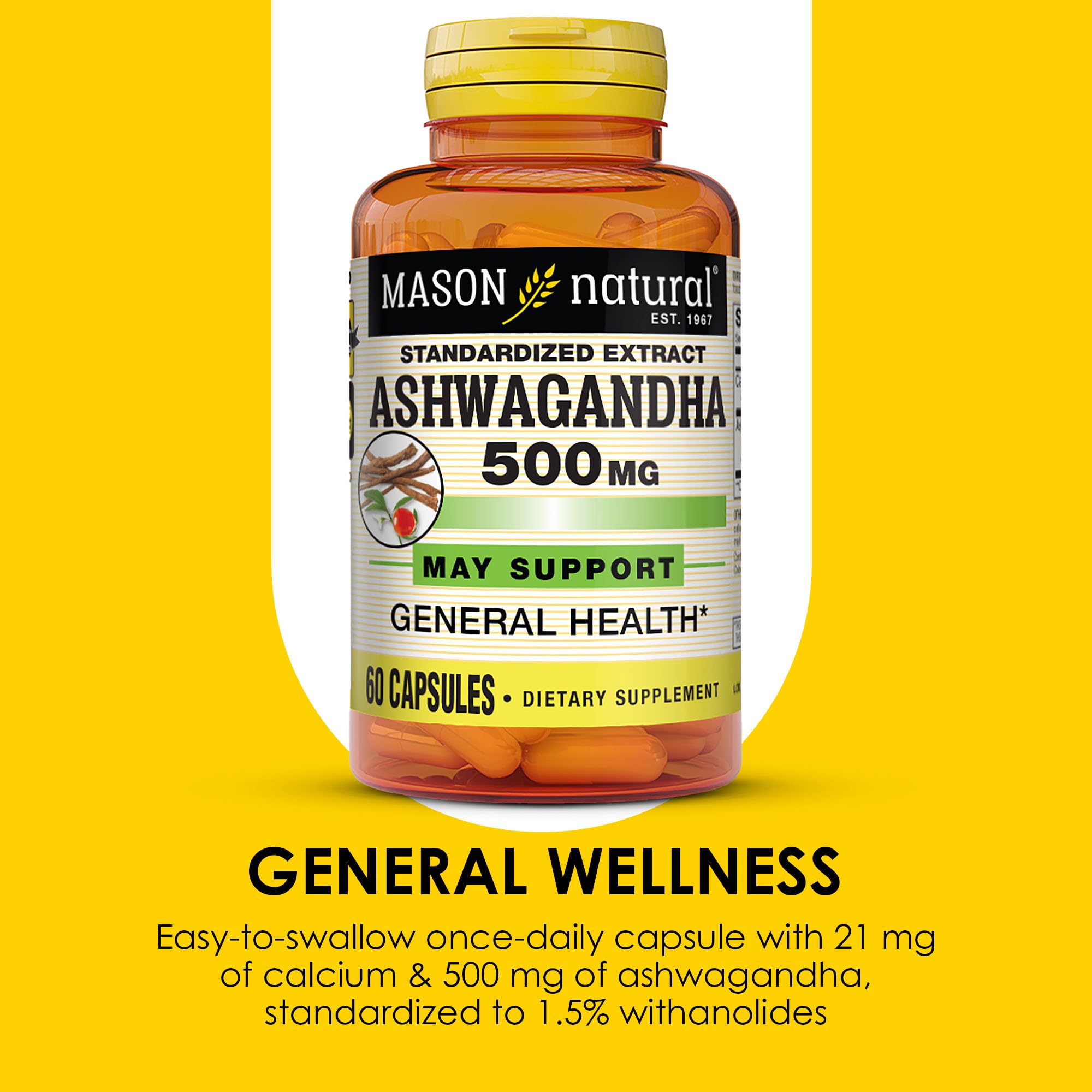 Mason Natural Ashwagandha 500 mg, Adaptogen for Stress & Energy Support, Herbal Supplement, 60 Day Supply