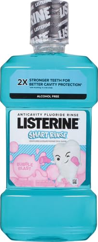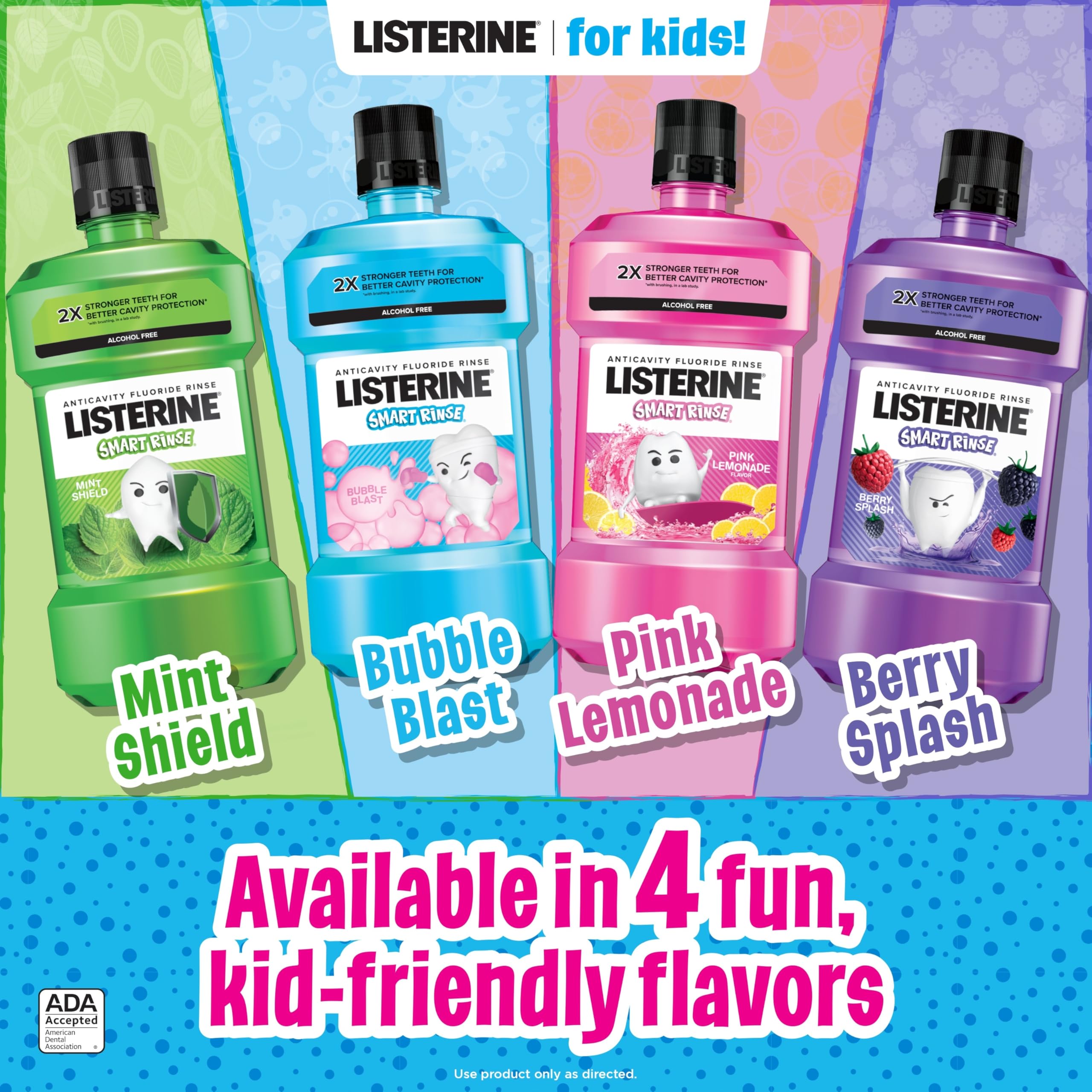 Help protect and strengthen your child's teeth with Listerine Total Care Kids Bubble Blast Anticavity Mouthwash. Accepted by the ADA and suitable for children aged six and older, this alcohol-free kids mouthwash provides 6 benefits in 1: all-day cavity protection, kills bad breath germs, strengthens teeth, kid-approved taste, freshens breath, and cleans the whole-mouth. Total Care Kids mouthwash helps fortify teeth, providing a deeper clean than brushing alone, and provides 24-hour cavity protection*, even in hard-to-reach areas. In a lab study, this alcohol-free mouthwash with fluoride and acidulated phosphate offered 2x stronger teeth for better cavity protection with brushing. This kids' oral rinse also freshens breath by killing 99% of bad breath germs. To encourage good daily oral hygiene habits, the anticavity mouthwash tints food particles so kids can see immediate proof of a cleaner mouth and it has a fun Bubble Blast flavor. *when used twice daily.