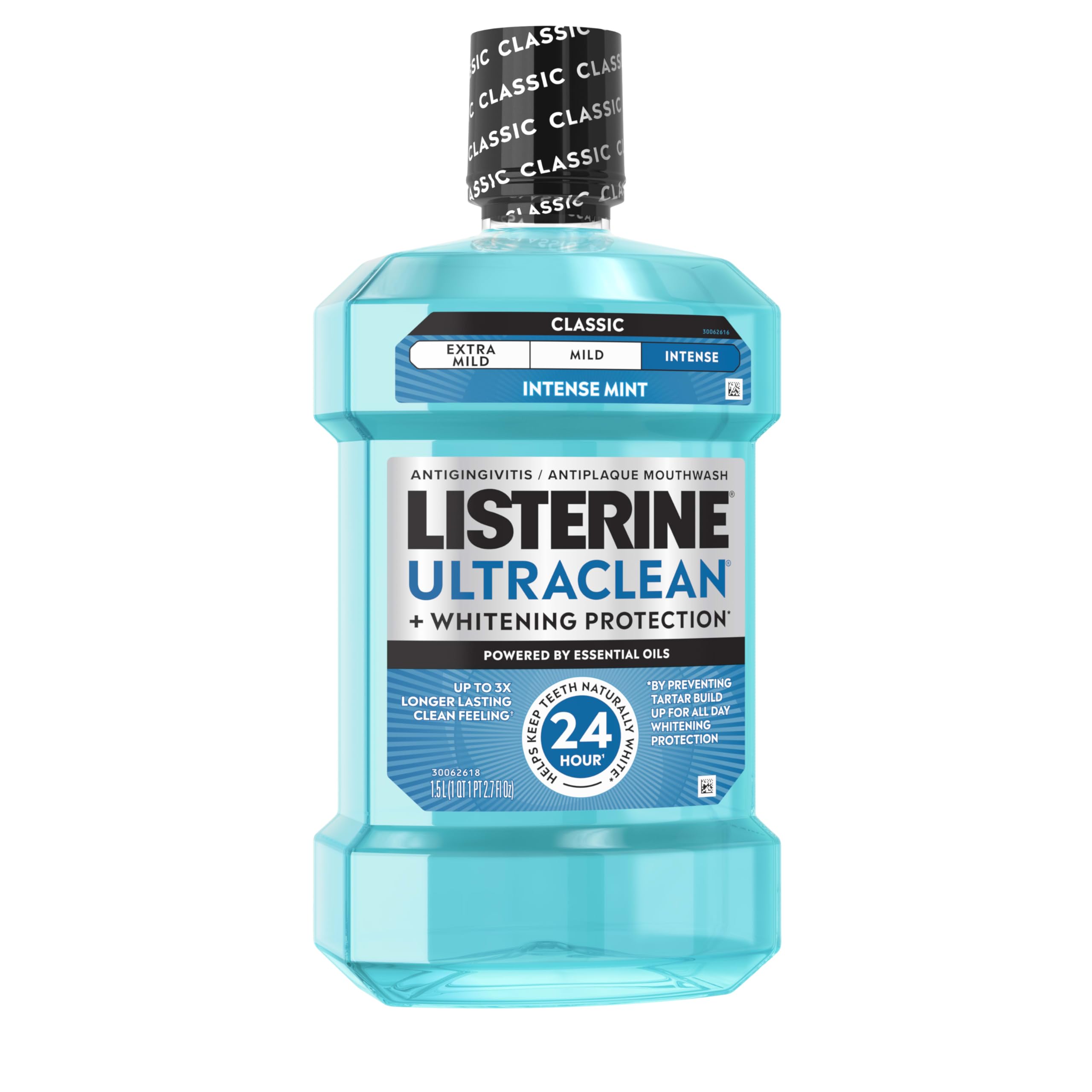 Listerine Ultraclean Intense Antiseptic Mouthwash + Whitening Protection*, Everfresh Technology to Help Fight Bad Breath, Gingivitis, & Plaque, Tartar Control Oral Rinse, Intense Mint, 1.5 L