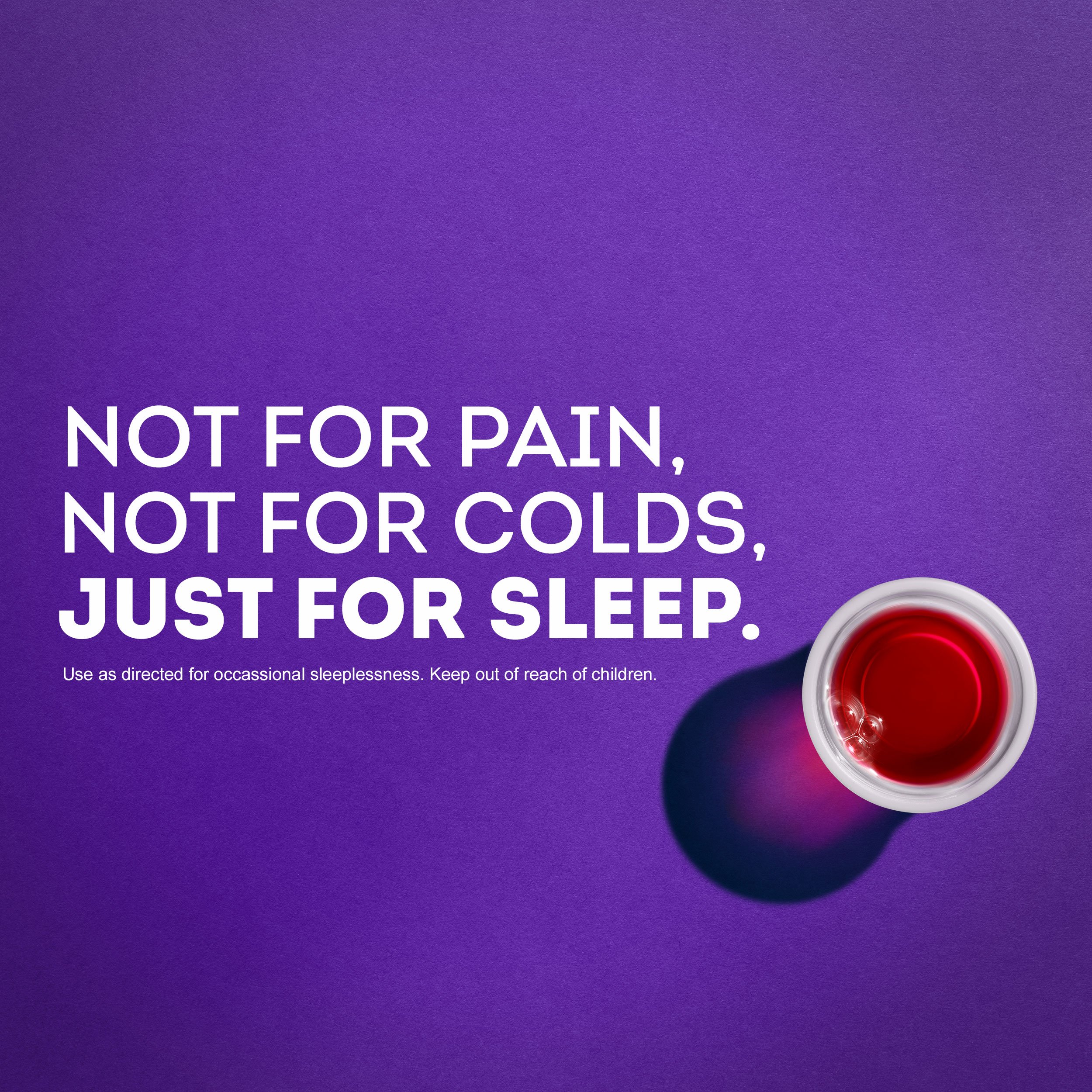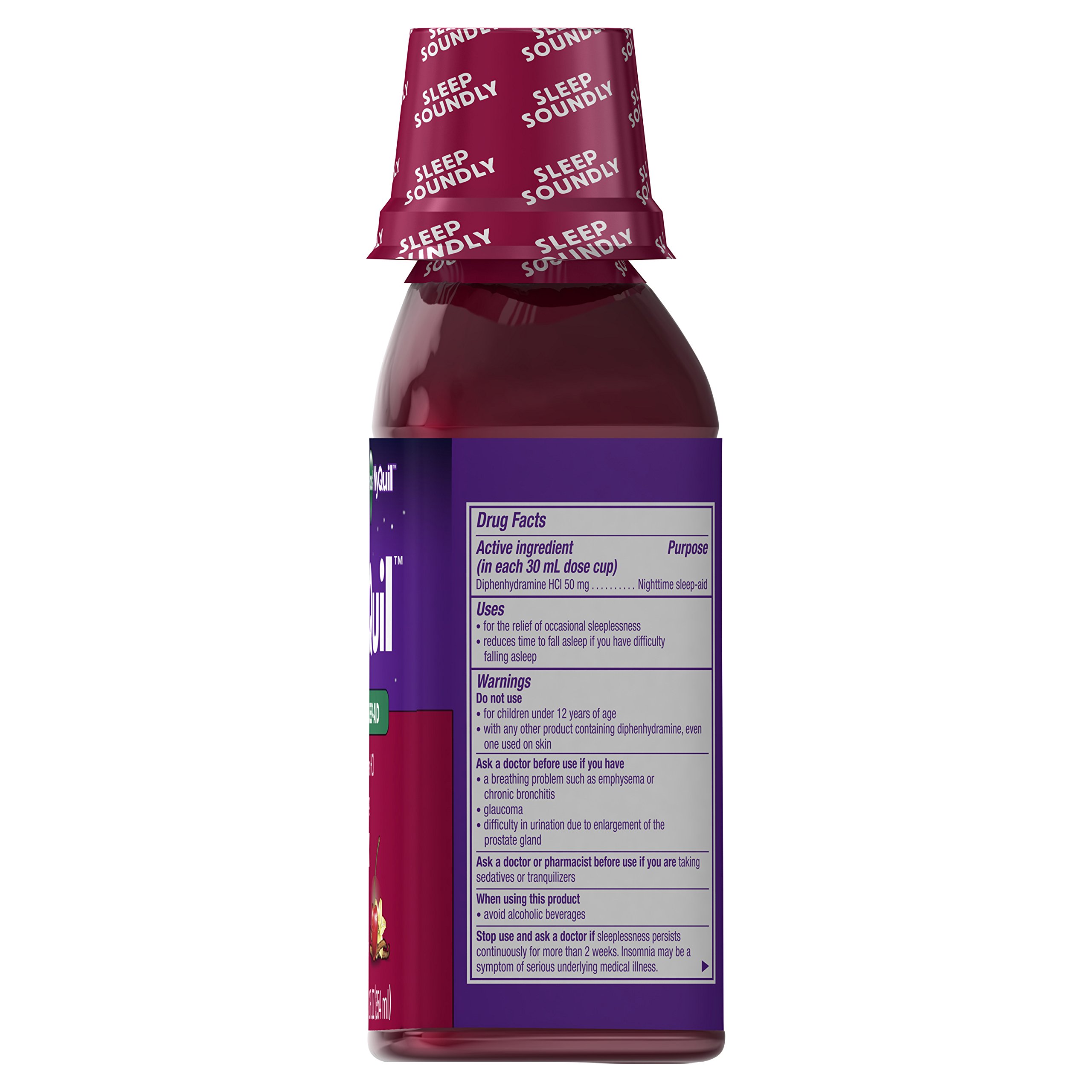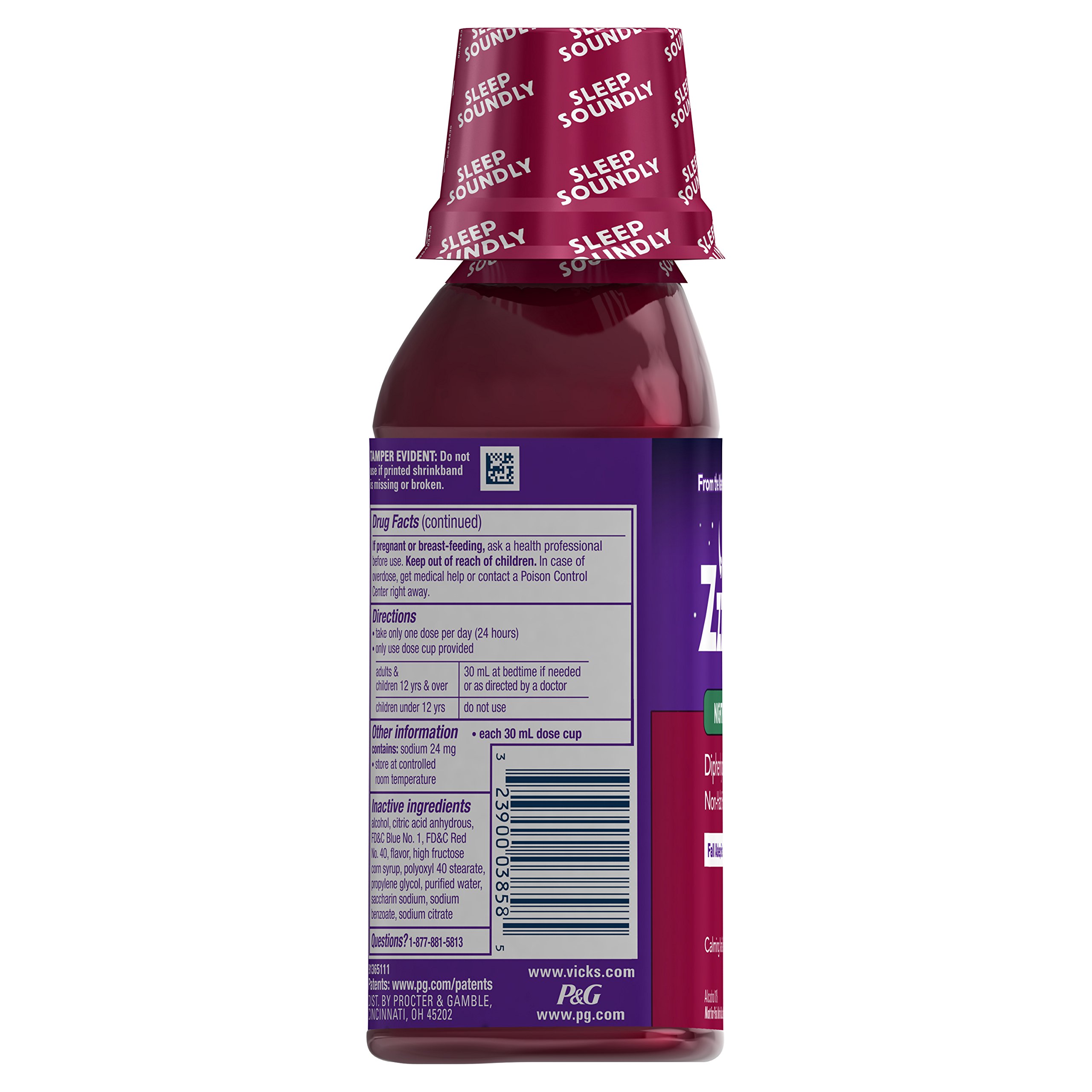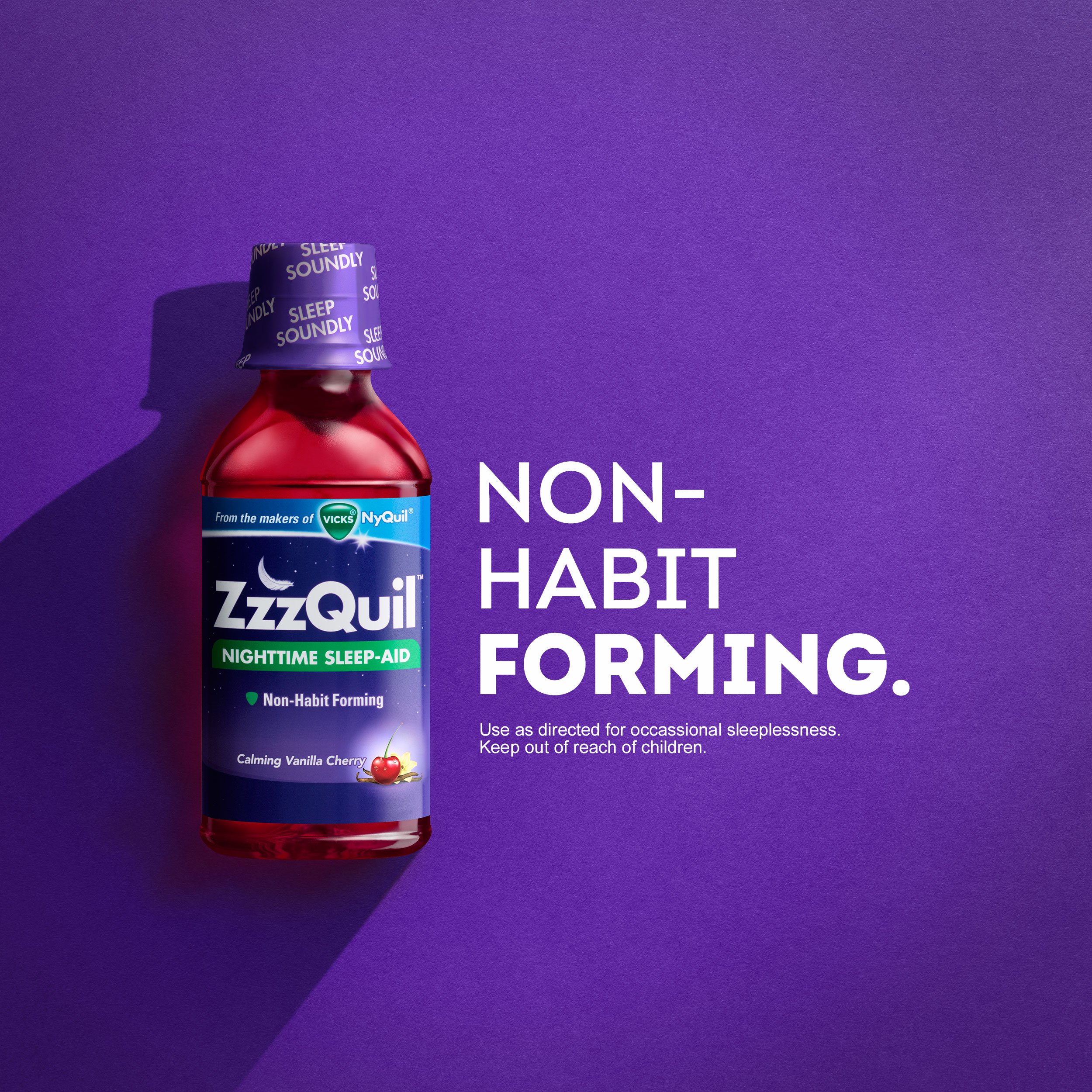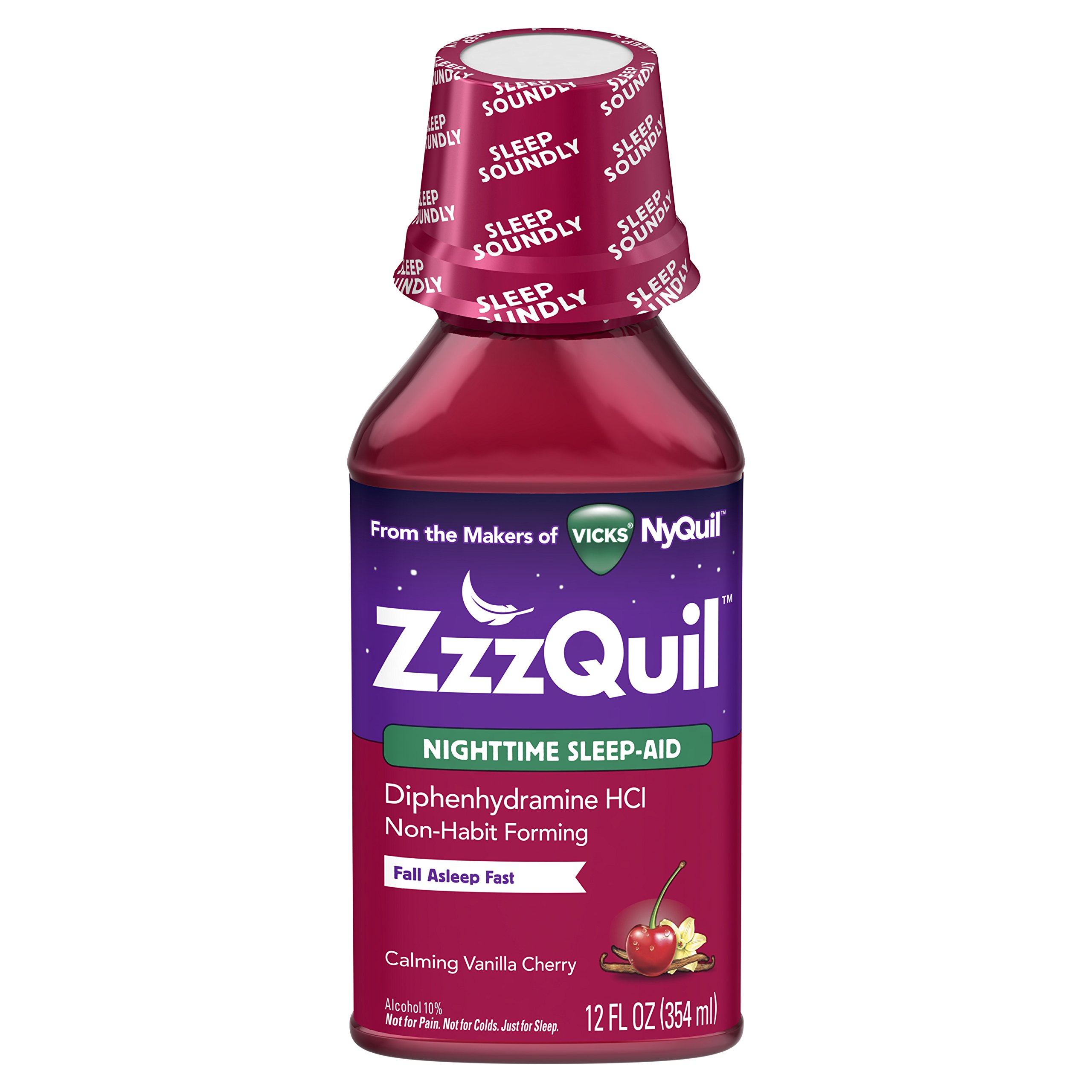 ZzzQuil Nighttime Sleep-Aid helps with occasional sleeplessness so you can fall asleep more easily and wake feeling refreshed. Each 30 mL dose cup contains 50 mg of diphenhydramine HCl, a non-habit-forming sleep-aid ingredient. The liquid formula comes in a calming vanilla cherry flavor and is designed for adults and children ages 12 years and older. Take only as directed using the included dose cup. ZzzQuil is from the makers of Vicks and is not for colds or for pain. NDC:69423-812-12; UPC: 323900038585