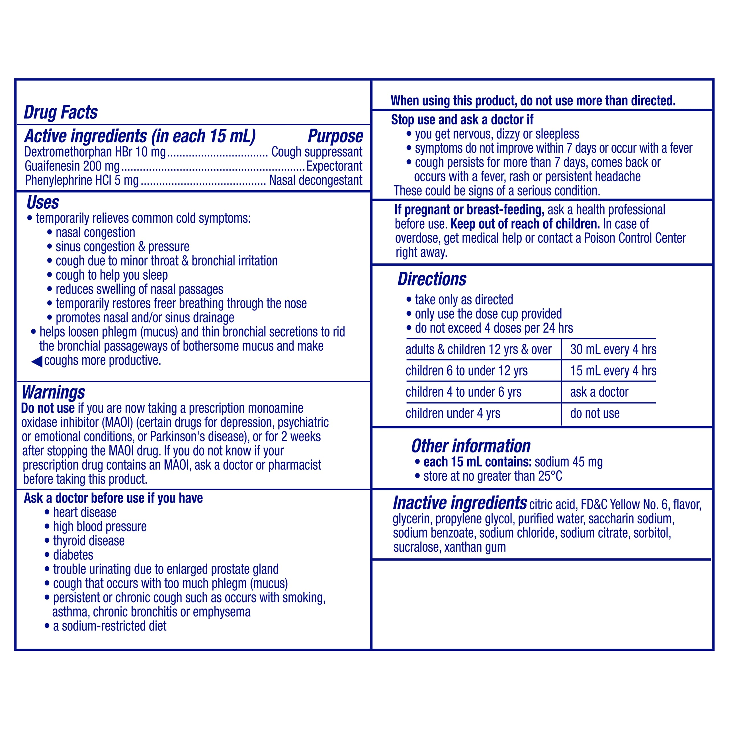 Have a bothersome cough? Don’t let constant coughing interrupt your day. From the world's #1 selling OTC cough and cold brand†, Vicks DayQuil Cough DM + Congestion provides fast, powerful, maximum strength relief for your worst cough symptoms. Vicks DayQuil Cough DM + Congestion is a non-drowsy daytime medicine that coats and soothes your throat and is specially formulated to relieve cough, chest congestion, nasal congestion, and thin and loosen mucus so you can power through your day. Use to temporarily relieve cough associated with the common cold and to help loosen phlegm (mucus) and thin bronchial secretions to rid the bronchial passageways of bothersome mucus. Vicks has been trusted for over 125 years to relieve your cough, cold and flu symptoms. DayQuil is the #1 pharmacist recommended nighttime cough, cold & flu brand* Active ingredients per 30 mL dose for adults are dextromethorphan HBr 20 mg (cough suppressant), guaifenesin 400 mg (expectorant/thins and loosens mucus), and phenylephrine HCI 10 mg (decongestant). Take only as directed. Only use the dose cup provided. Do not exceed 4 doses per 24 hours. *2022 Pharmacy Times Survey of Pharmacists OTC Recommendations † Nicholas Hall’s global CHC sales database, DB20