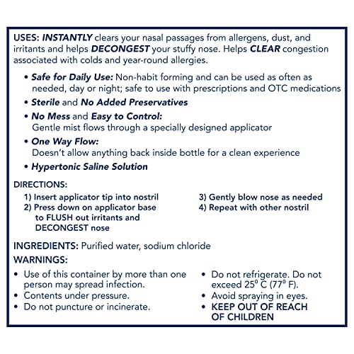 Relief you can trust from Vicks, the world’s #1 selling cough and cold brand! Vicks Sinex, the brand your nose knows and loves, now carries a drug-free saline spray! Instantly clear everyday congestion with Vicks Sinex Saline Ultra Fine Mist Nasal Spray. Helps clear nasal congestion by washing dust, allergens, irritants, and mucus from the nose. Plus it's safe for daily use because it is drug-free with no added preservatives. It is simply a hypertonic saline solution made with purified water. Its special ultra fine mist spray is designed to deliver gentle yet effective relief! Can be used daily, as often as needed, to treat sinus congestion caused by a cold or seasonal allergy spell. Vicks Sinex Saline is safe to use with OTC or prescription medicines. For children and adults age 2 or older (with adult supervision): Spray in each nostril and blow your nose as needed to instantly clear your everyday congestion.