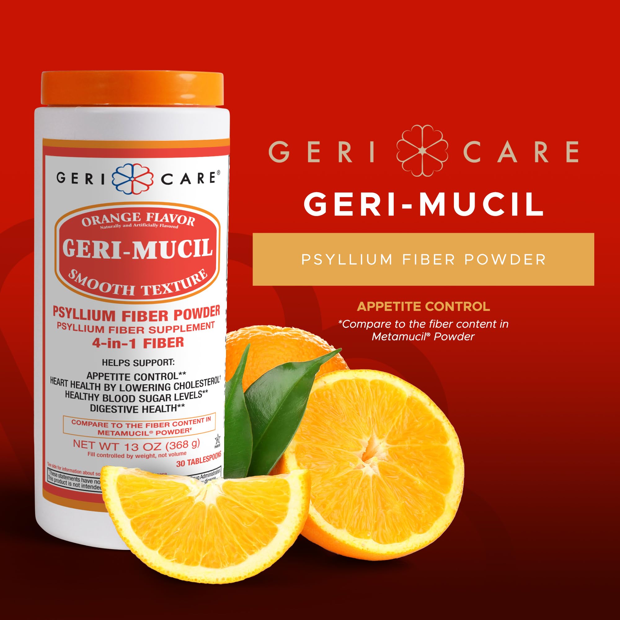 Geri-Mucil Psyllium Powder By GeriCare|4-In-1 Orange-Flavor Psyllium Husk Powder| Daily Fiber Supplement| Sweetened Gluten-Free Fiber Drink Mix| Water-Soluble Husk Fiber Powder For Bowel Movement|13oz