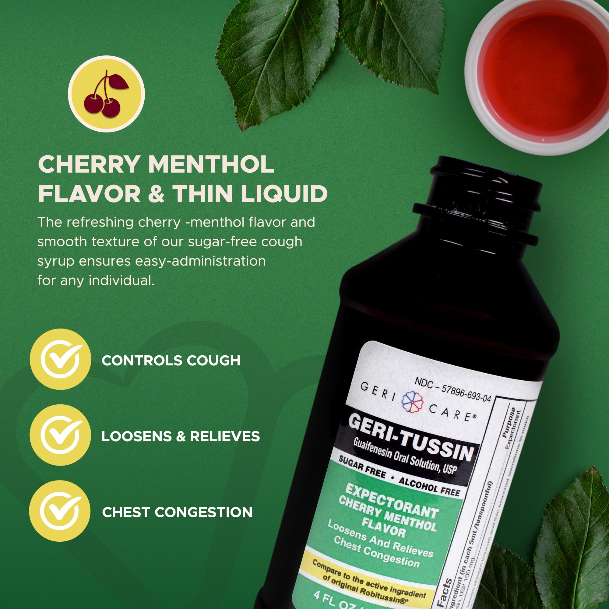 Geri-Tussin Cold and Cough Relief Guaifenesin Syrup by GeriCare| Sugar-Free Guaifenesin Liquid Expectorant| Cough Syrup & Chest Decongestant| Cherry Menthol Flavor Guaifenesin Oral Solution| 4 Fl Oz