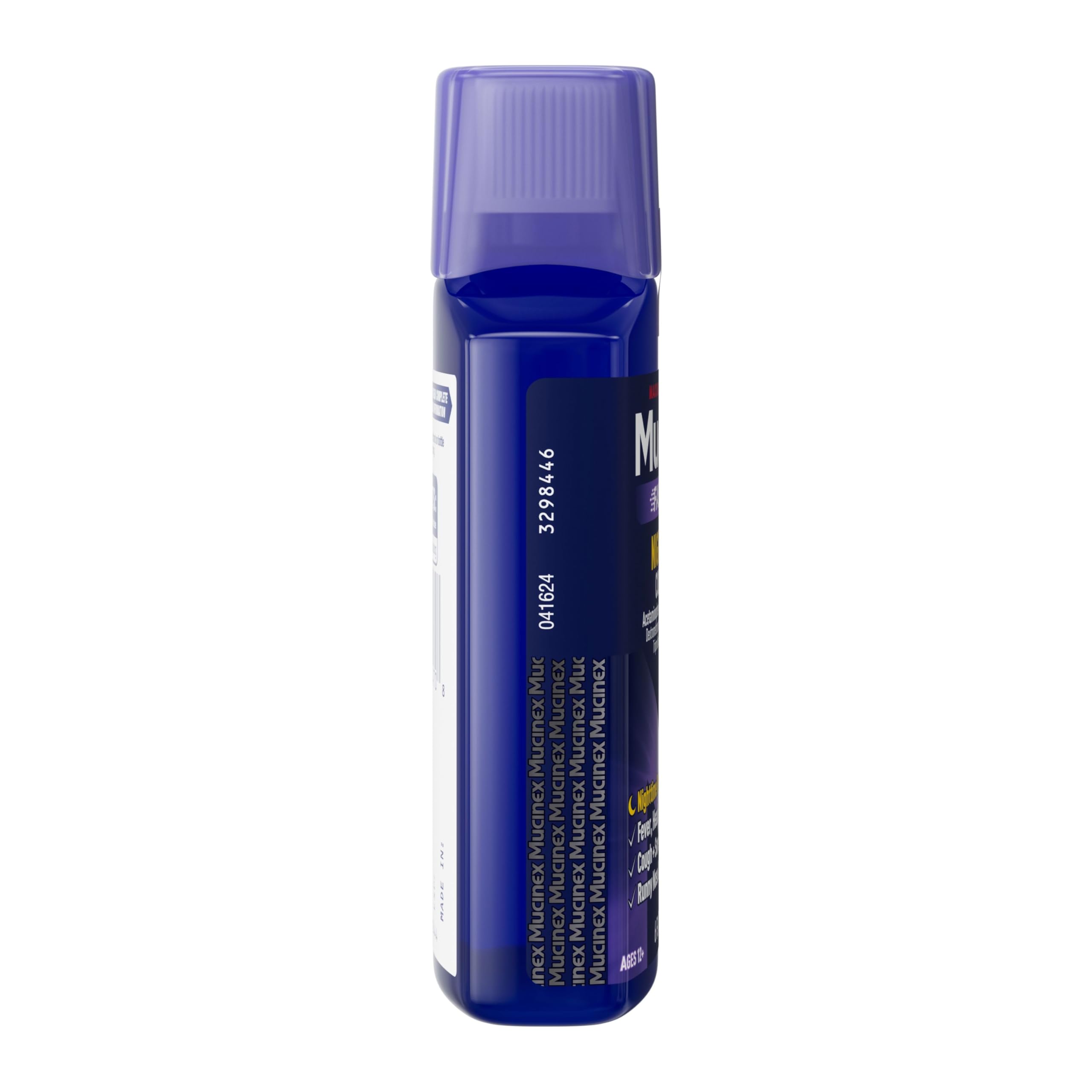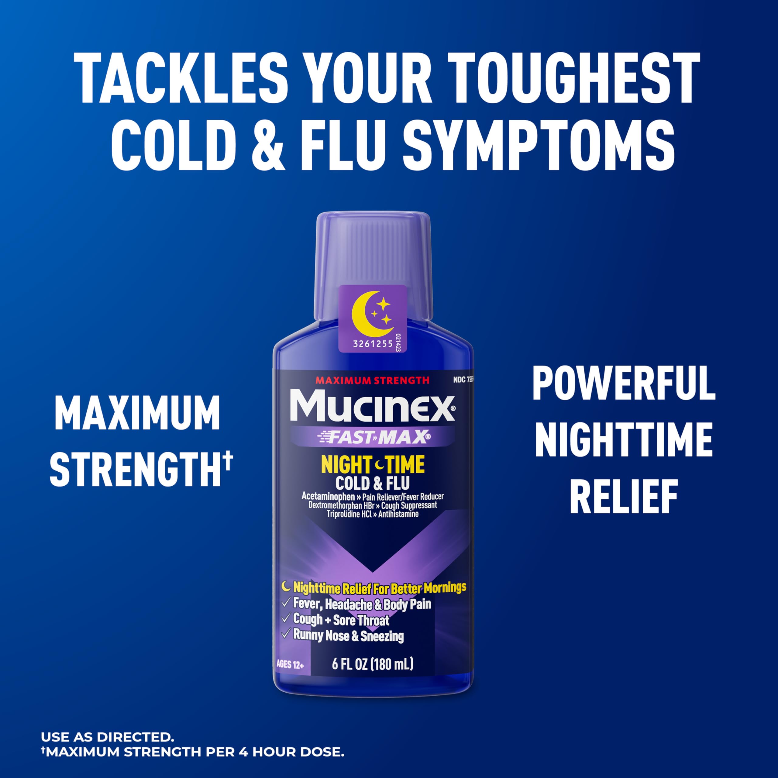 Mucinex Nightshift Cold & Flu is a Nighttime Multi-Symptom Relief medicine for your Cold & Flu Symptoms. Mucinex Nightshift Cold & Flu helps reduce fever, relieve pain, headache, cough, runny nose, sneezing and sore throat . Mucinex is the #1 Cough & Cold Brand Doctors Trust*. This product contains 6 Fluid Ounces. Use as directed, for Adults and Children 12 years of age and over. SYMPTOMS RELIEVED: Mucinex Nightshift Cold & Flu helps reduce fever, relieve pain, headache, cough, runny nose, sneezing and sore throat ACTIVE INGREDIENTS: Contains Acetaminophen - pain reliever/fever reducer; Dextromethorphan HBr - cough suppressant; Triprolidine HCl – Antihistamine to alleviate sneezing, runny and itchy nose and watery eyes Take only as Directed *IQVIA using ProVoice Survey, December 2022
