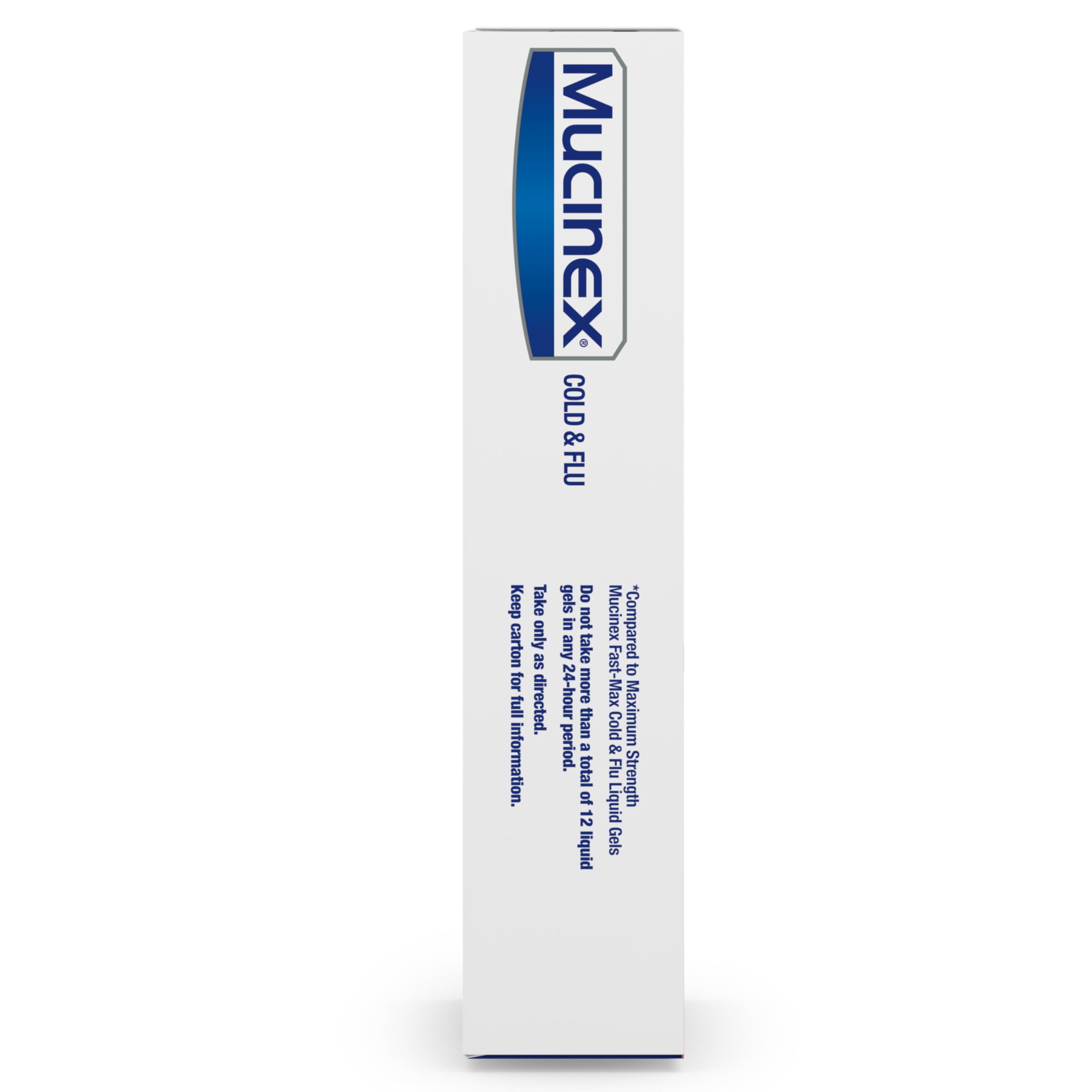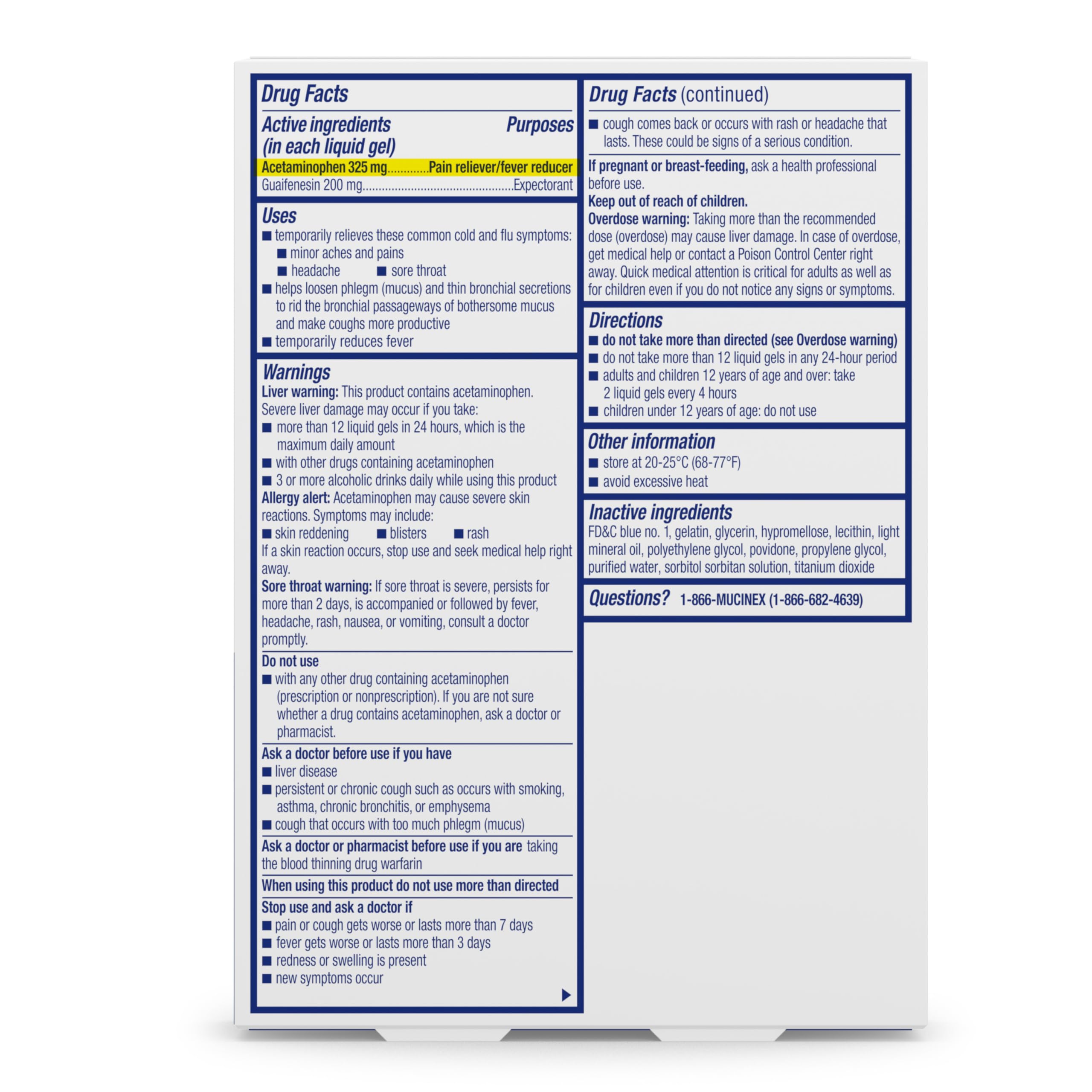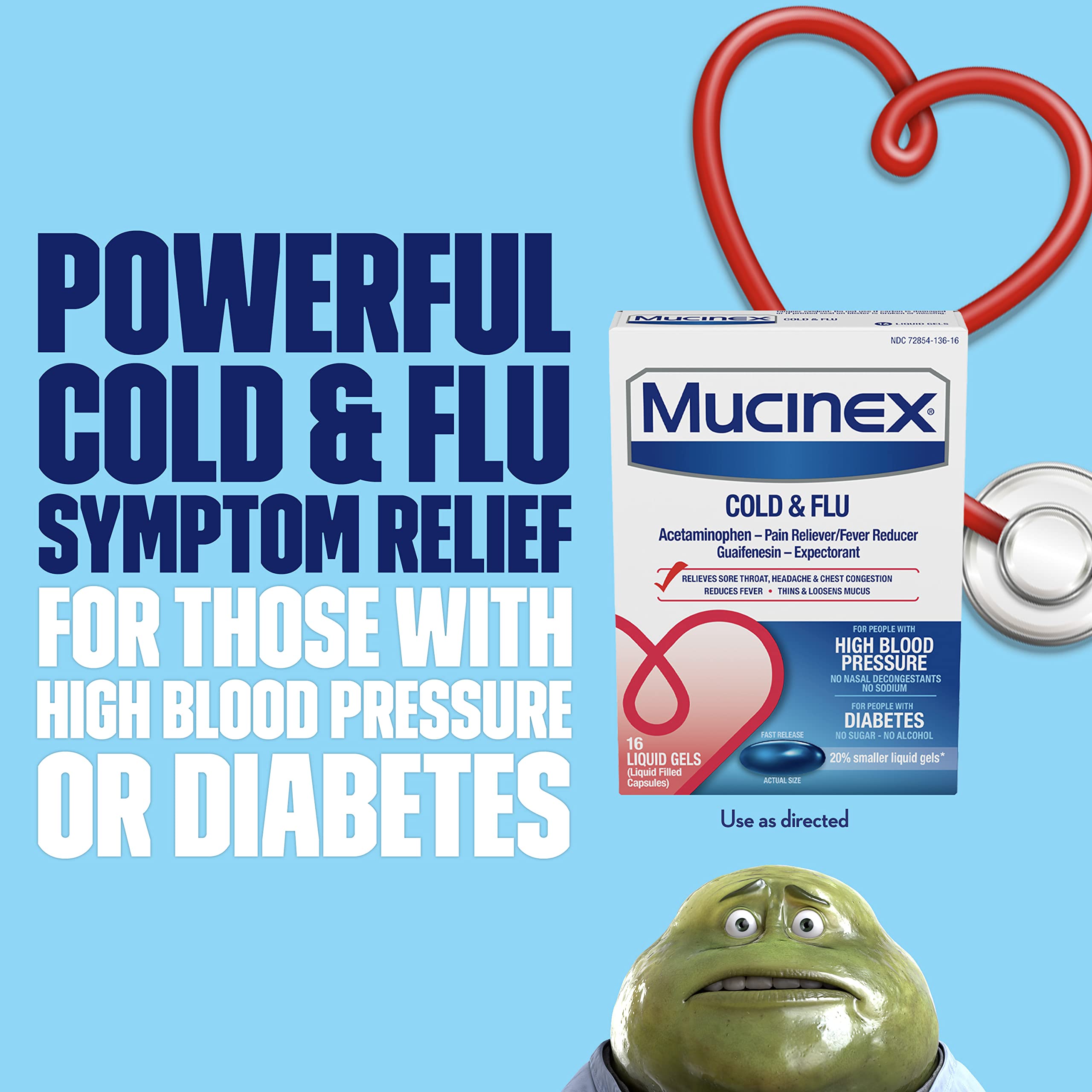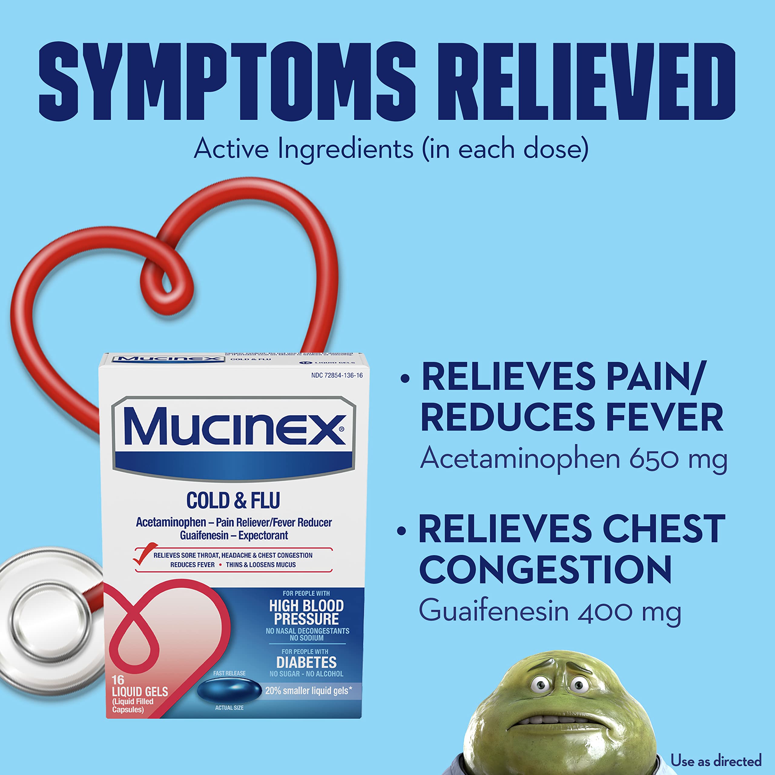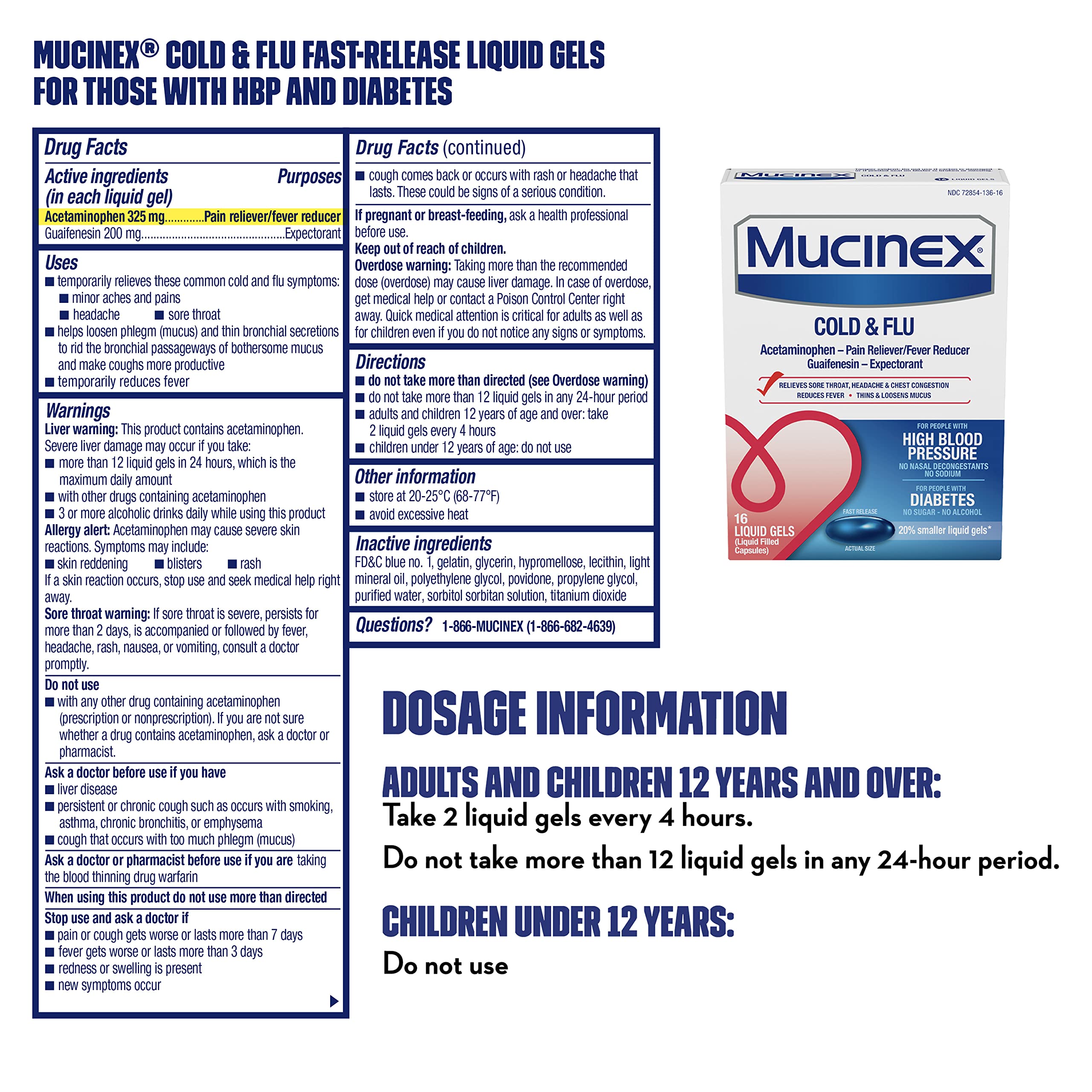 Mucinex Cold and Flu temporarily relieves sore throat, headache, chest congestion, reduces fever, thins and loosens mucus. These fast release liquid gels do not contain nasal decongestant, sodium, sugar or alcohol making them suitable for people with high blood pressure and for people with diabetes. The active ingredients are acetaminophen and guaifenesin. This product contains 16 liquid gels and can be used by adults and children 12 years and over.