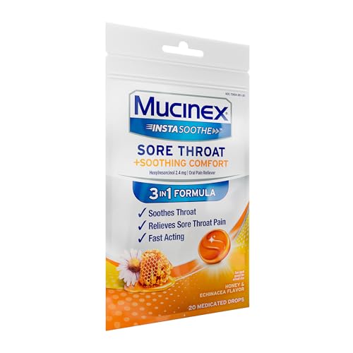 Mucinex Instasoothe Sore Throat Relief Drops, Sore Throat Lozenges, Sore Throat Medicine with Hexylresorcinol, Cough Drops Alternative, Honey & Echinacea Flavor Medicated Numbing Throat Drops, 20 ct