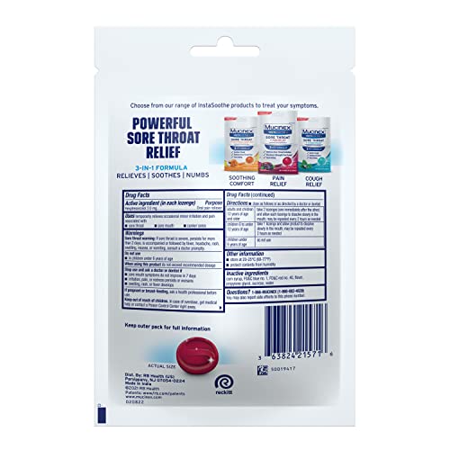Mucinex Instasoothe Sore Throat Relief, Sore Throat Lozenges, Sore Throat Medicine with Hexylresorcinol, Cough Drops Alternative, 20 Elderberry & Wild Cherry Medicated Numbing Throat Drops