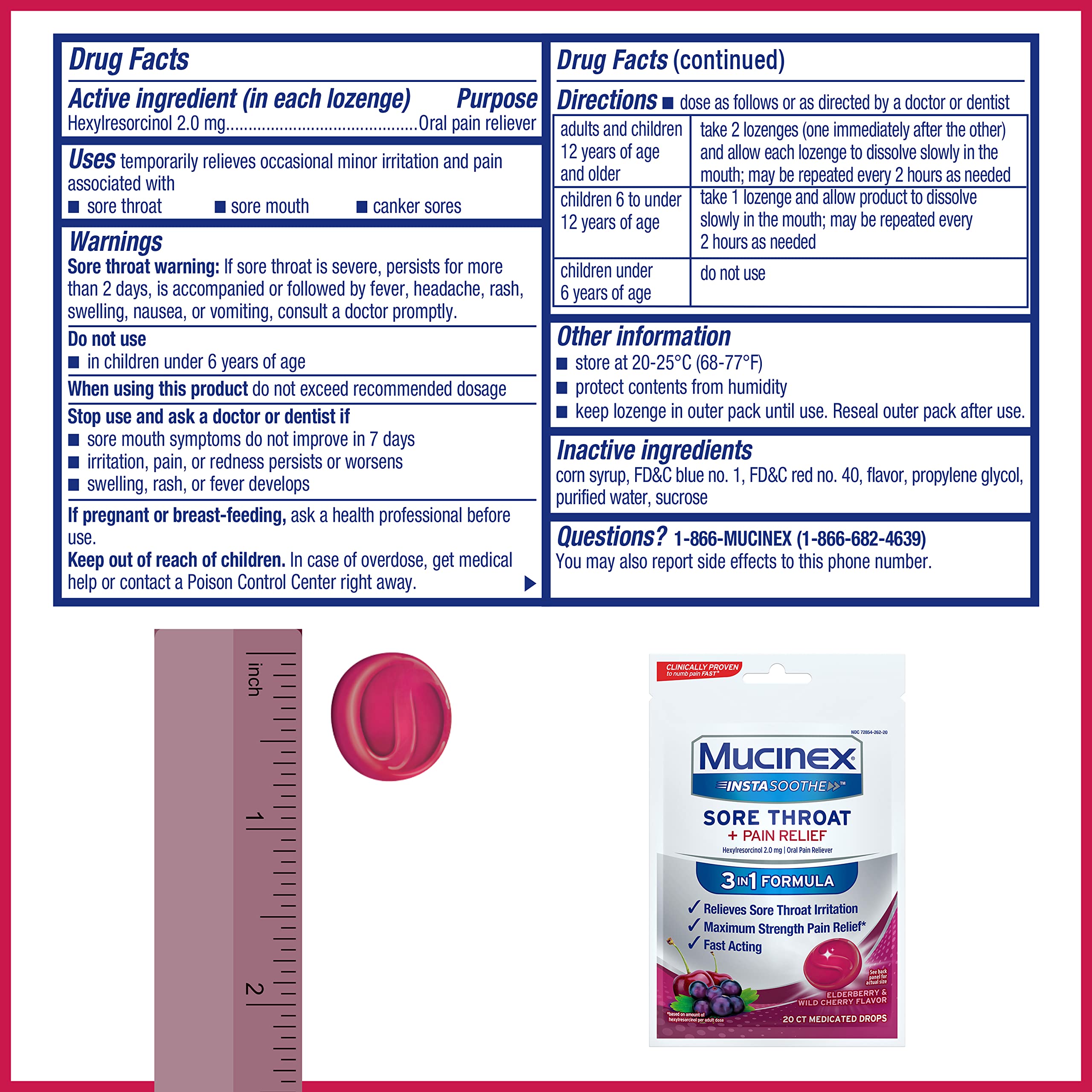Mucinex Instasoothe Sore Throat + Pain Relief medicated throat drops have a powerful 3 in 1 formula that relieves, soothes, and numbs sore throats. These elderberry & wild cherry flavor sore throat lozenges provide rapid relief that lasts & lasts. The active ingredient Hexylresorcinol, an oral pain reliever, provides powerful sore throat relief without menthol. Each medicated drop has less than 10 calories and 2.5g of sugar (no artificial sweeteners here!).