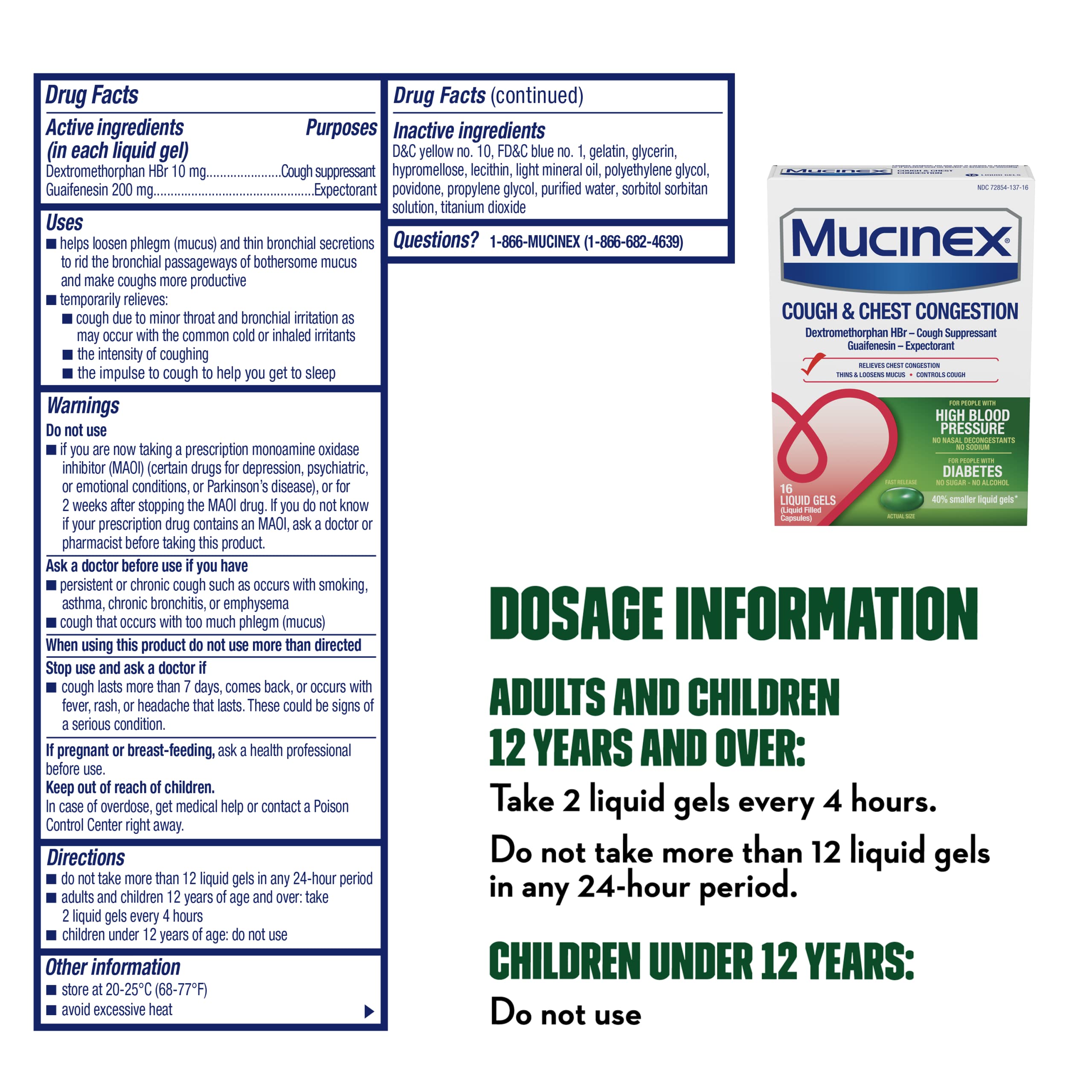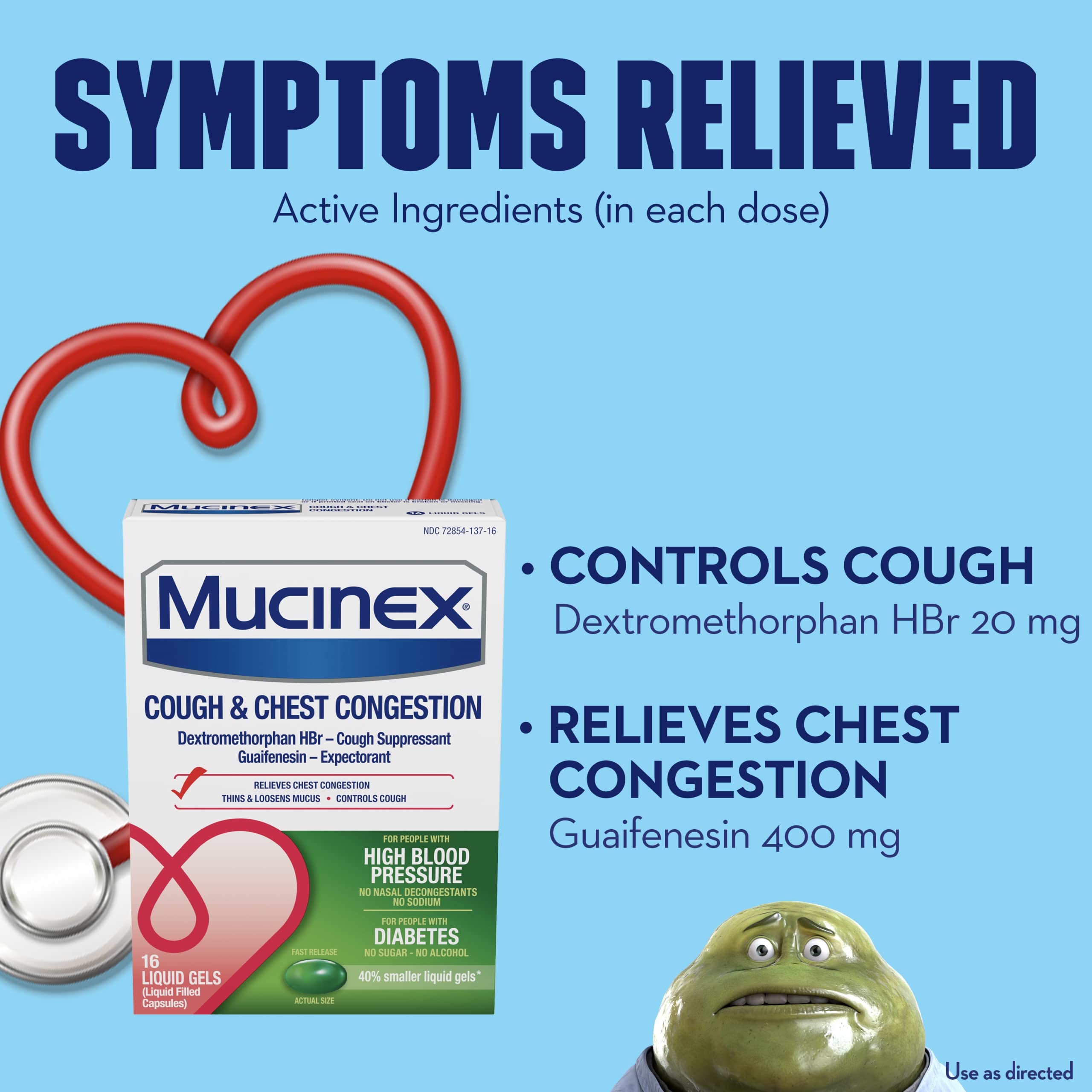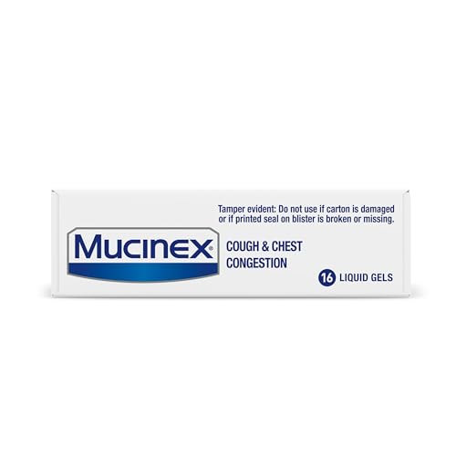Mucinex Cough and Chest Congestion provides chest congestion relief, thins and loosens mucus as well as controls coughs. These fast release liquid gels do not contain nasal decongestant, sodium, sugar or alcohol and are suitable to consume by people with high blood pressure and people with diabetes. The active ingredients are dextromethorphan HBr and guaifenesin. This product contains 16 liquid gels and can be used by adults and children 12 years and over.