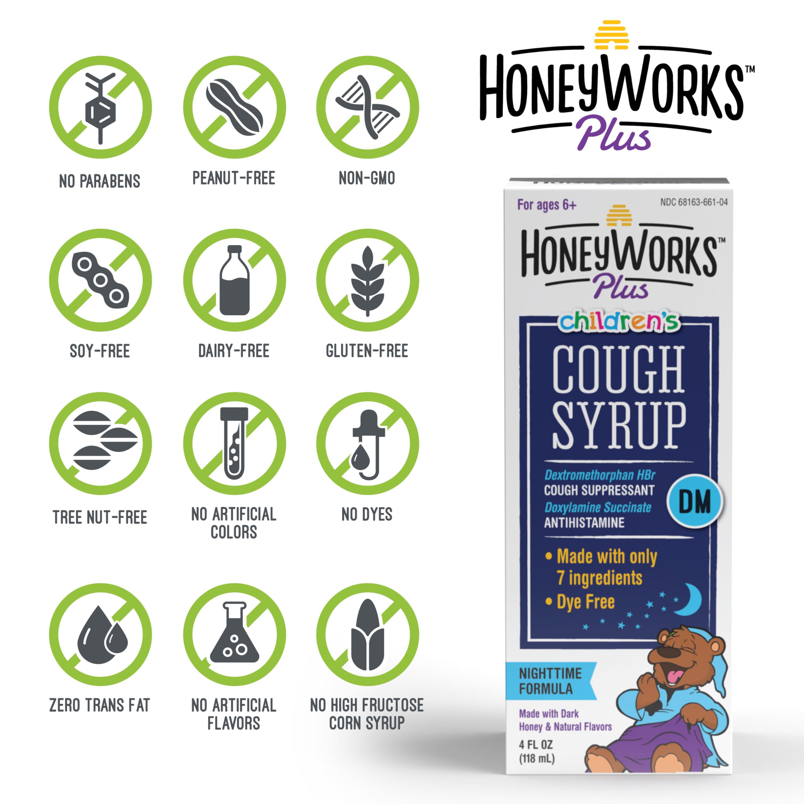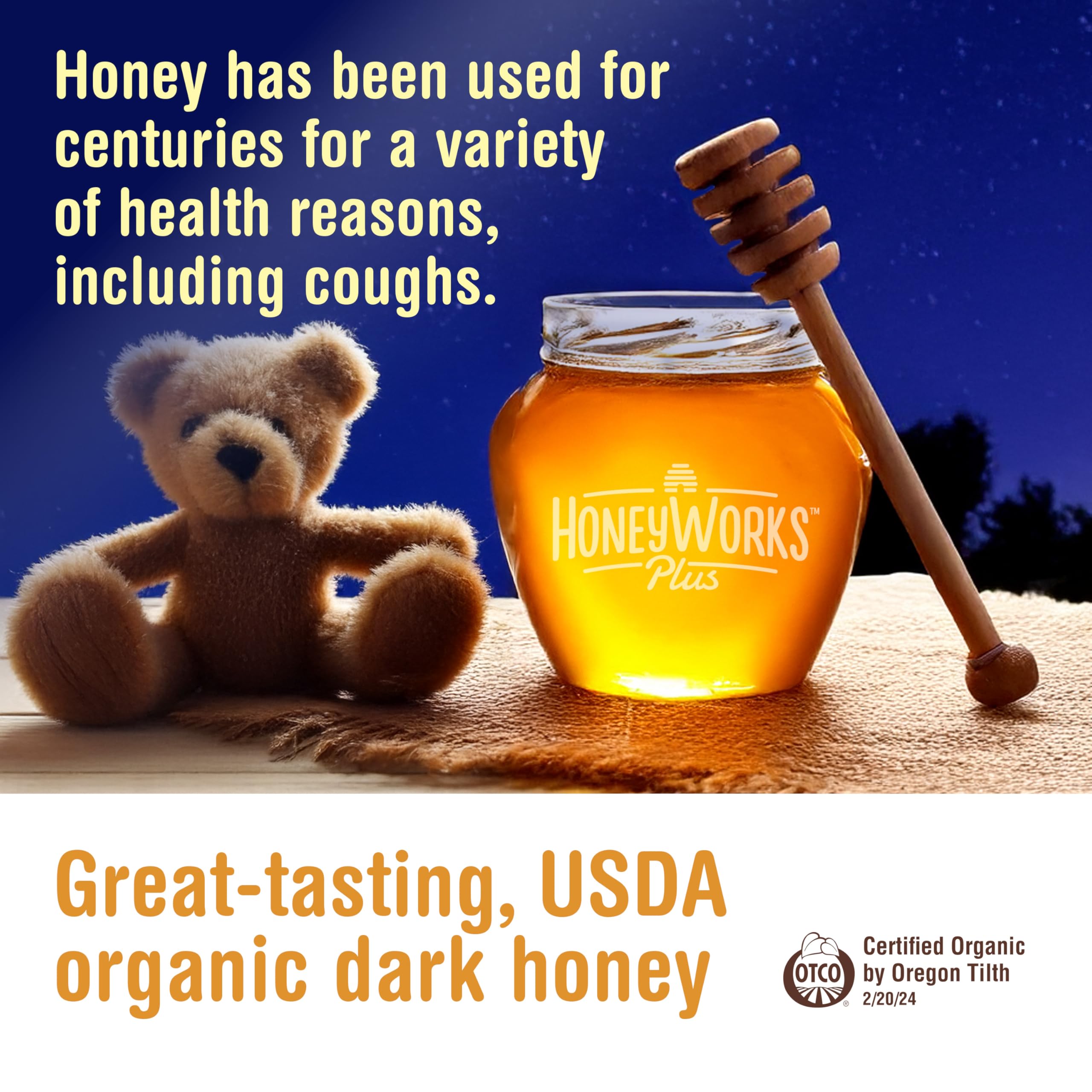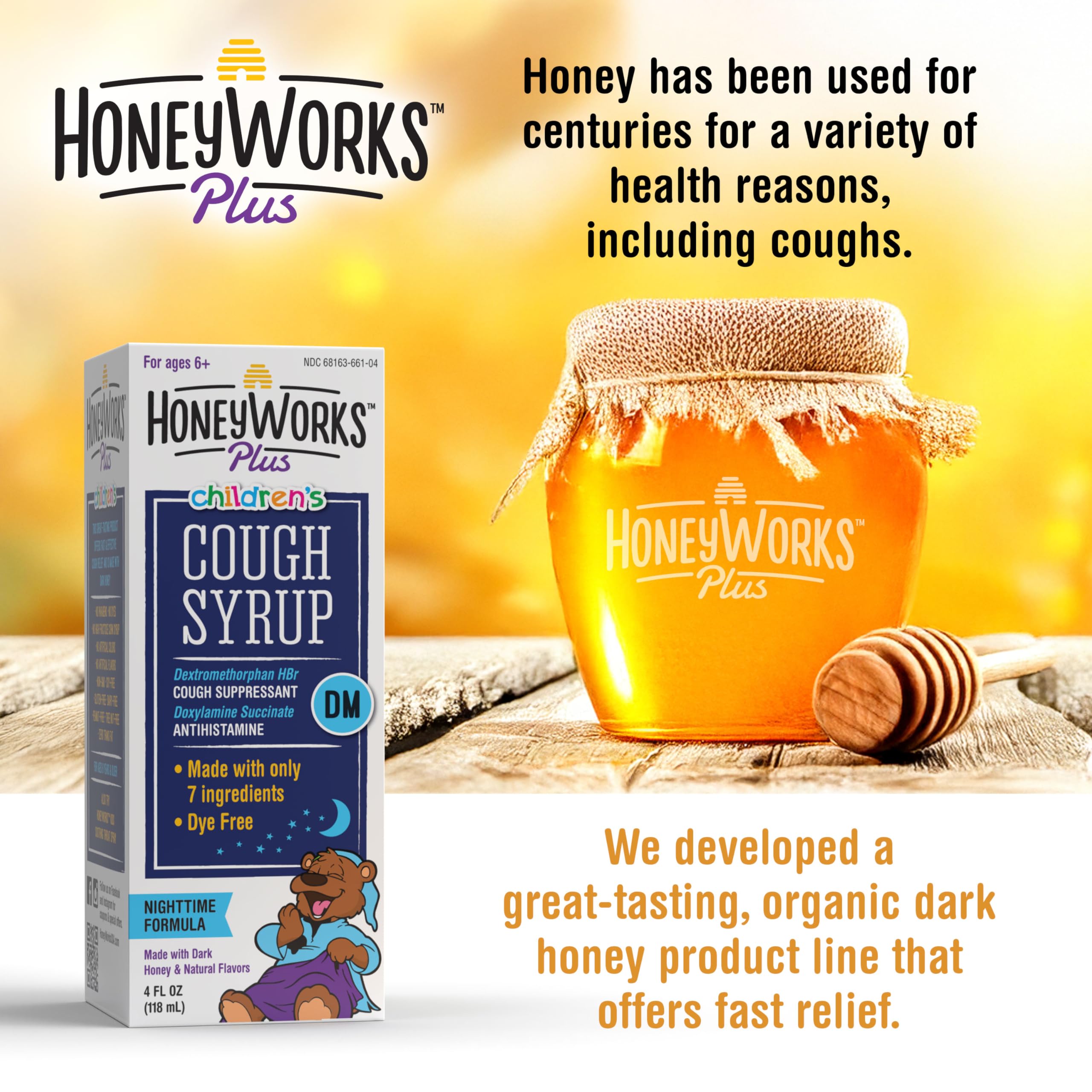 HoneyWorks Nighttime Cough Syrup for Kids with Organic Honey, 4 Oz, Helps Soothe Cough, Throat Irritation with Dark Honey, Ivy Leaf Extract, Melatonin