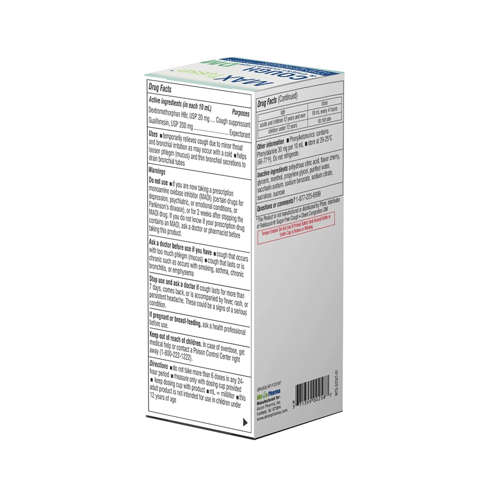 MAXTussin Cough & Chest Congestion Relief DM (2-Pack) is a dual-action formula that provides fast and effective relief from coughs and chest congestion. Each 8 fl oz bottle contains Dextromethorphan HBr (20 mg per 10 mL) to suppress dry coughs and Guaifenesin (200 mg per 10 mL) to loosen mucus, making it easier to breathe. This cherry-flavored liquid is alcohol-free, dye-free, and gluten-free, ensuring a gentle, non-drowsy experience for adults and children ages 12 and older.