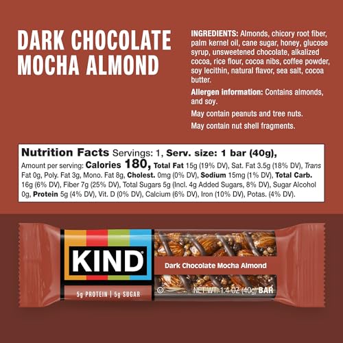 We agree coffee is too good to be limited to one cup of joe in the AM. Savor the taste of dark chocolate mocha all day with this buzz worthy almond-packed snack with 5g of sugar per bar. This bar has 5g sugar; the average nutrition bar has 12g sugar. Contains 15g of fat per bar. Made in facility that processes peanuts, tree nuts, soy and sesame seeds.