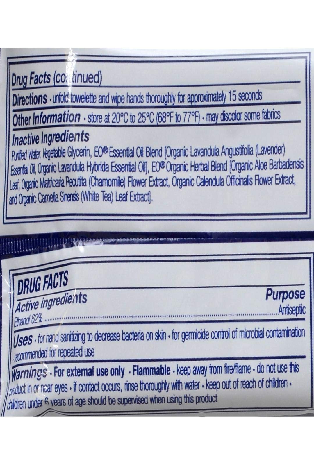 Hand Cleansing Wipes - 10 ct pack EO® Cleansing Wipes the organic, plant based alternative to chemical laden hand wipes. All-purpose. Cleans and sanitizes hands and other dirty things. Delivers a minimum of 62% organic alcohol (non - GMO) to sanitize on contact. EO Natural bamboo wipes are moistened with Pure Essential Oils and Organic Aloe Vera to cleanse and moisturize gently and naturally. French Lavender heals and soothes naturally. Delivers 62% organic alcohol to sanitize hands. Organic Chamomile, Calendula and white tea botanicals harmonize and replenish skin. Made from nature's most sustainable resource, these wipes are 100% biodegradable. Ingredients found in this product: Organic Alcohol, Purified Water, EO Essential Oil Blend [Organic Lavender (Lavandula Officinalis) Essential Oil, Organic Lavandin (Lavandula Hybrida) Essential Oil], EO Organic Herb Blend [Organic Chamomile (Anthemis Nobilis) Extract, Organic Aloe Vera (Aloe Barbadensis) Extract, Vegetable Glycerin Organic White Tea (Camellia Sinensis) Extract, Organic Calendula (Calendula Officinalis) Extract] Key Ingredients: Lavender, Ethanol, Aloe Vera