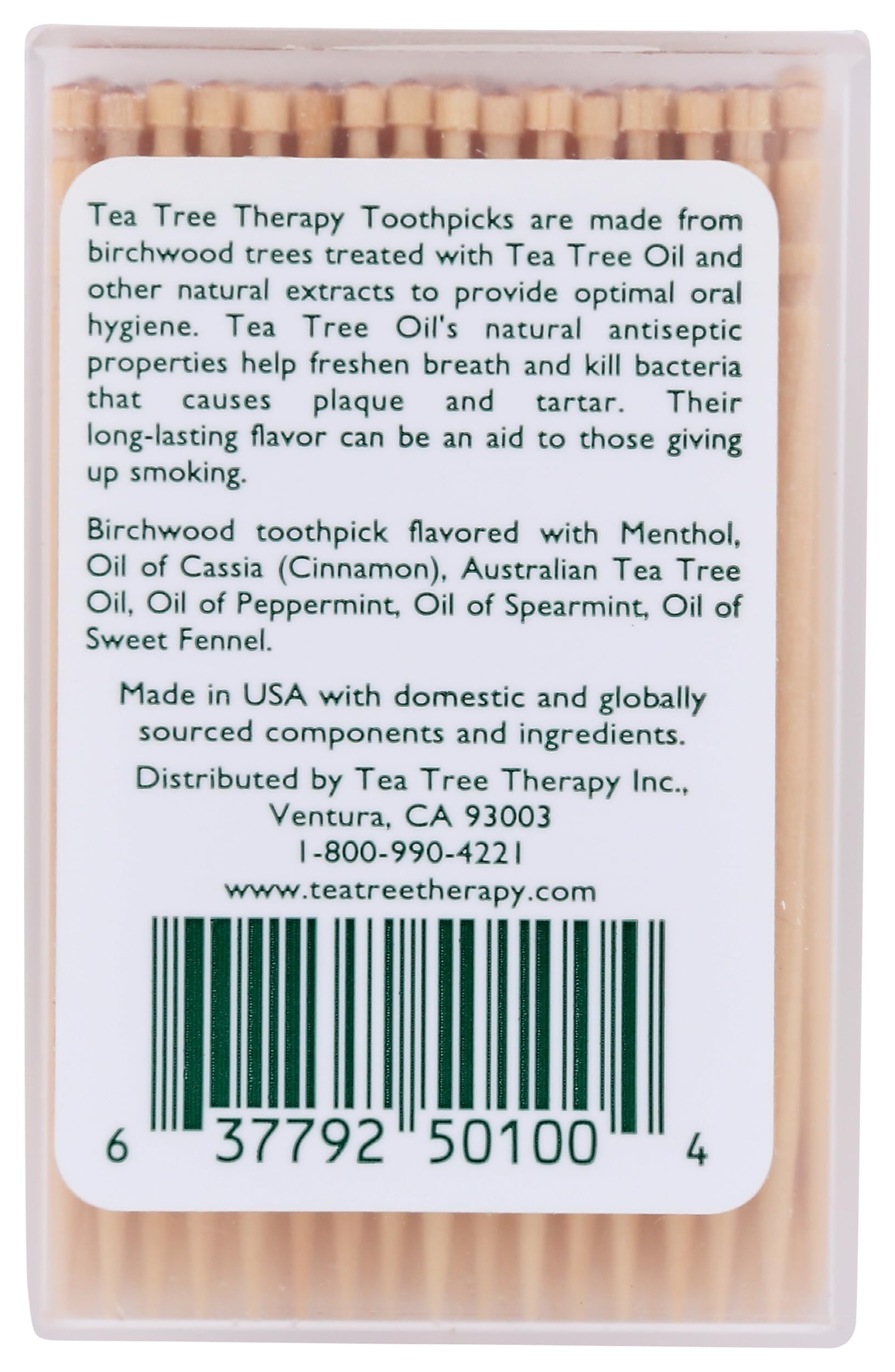 Tea Tree Therapy Tea Tree Toothpick - 100 per pack -- 12 packs per case. Birchwood infused with Tea Tree Oil and other natural extracts Tea Tree Therapy Toothpicks are made from birchwood trees treated with Tea Tree Oil and other natural extracts to provide optimal oral hygiene. Tea Tree Oils natural antiseptic properties help freshen breath and kill bacteria that causes plaque and tartar. Their long-lasting flavor can be an aid to those giving up smoking. Shelf Life: 360 days