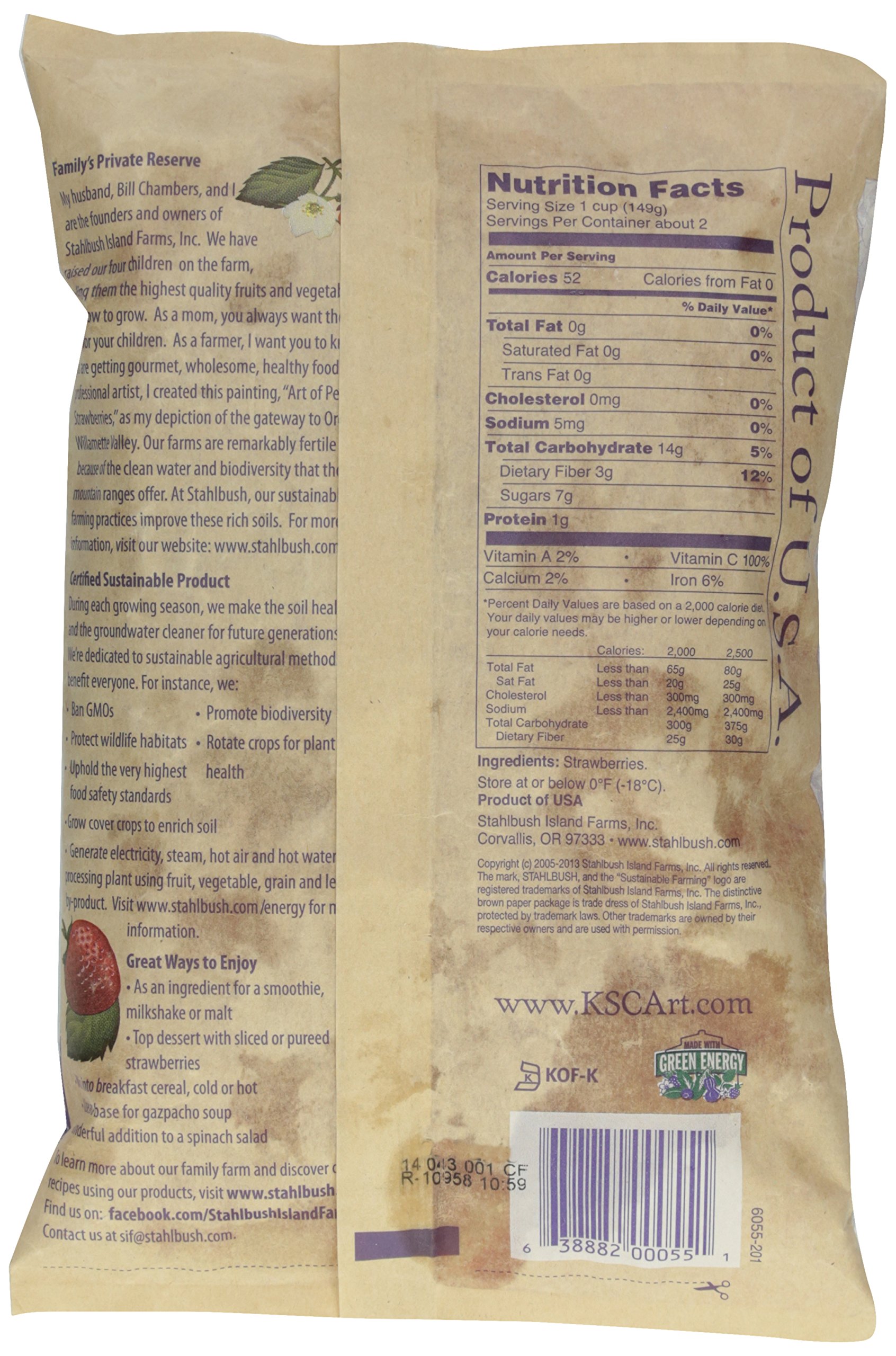 Stahlbush Island Farms is a Real Family Farm. Company founders Bill and Karla Chambers started farming in Oregon's Willamette Valley in 1985, planting and harvesting just 2 crops. With a heritage of family farms in Oregon for over a century, the founders of Stahlbush have always recognized the importance of caring for the land, and in 1997 became the first farm to become Certified Sustainable by the Food Alliance. Unlike most farms, Stahlbush Island Farms is also a food processor.