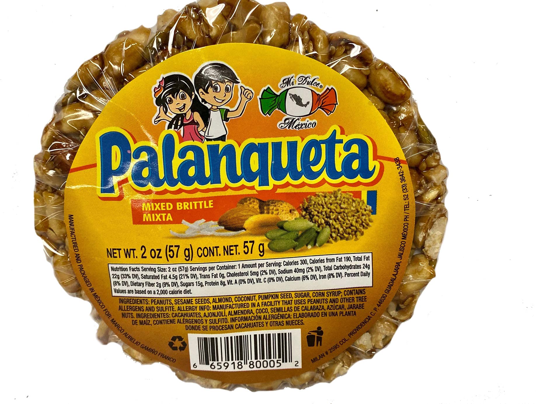 MI DULCE MEXICO PALANQUETA MIXED BRITTLE (MIXTA) 5PCS each piece is 2oz (57) grams. contains peanuts,sesame seeds, almond, pumpkin seeds, sugar and corn syrup