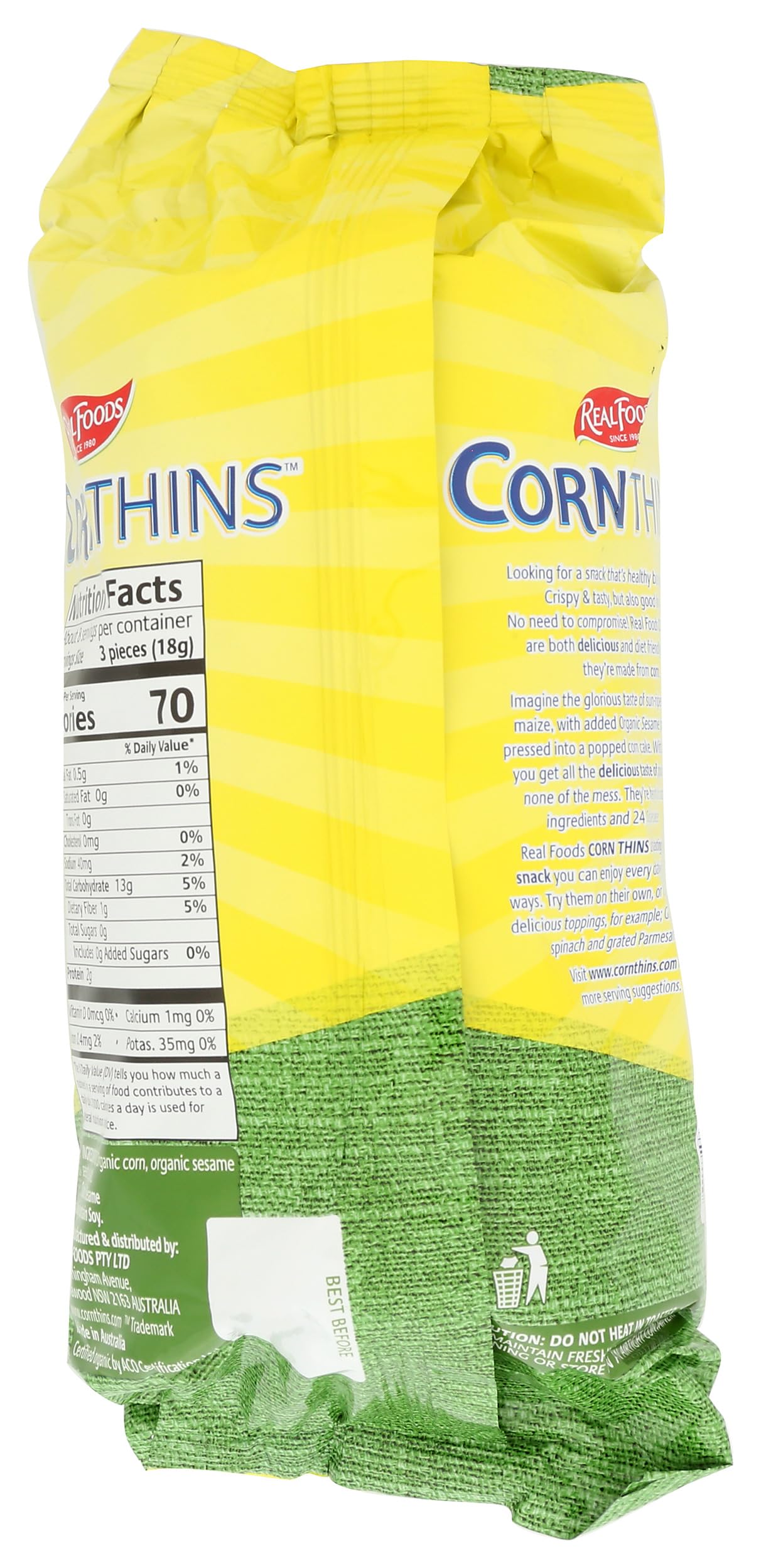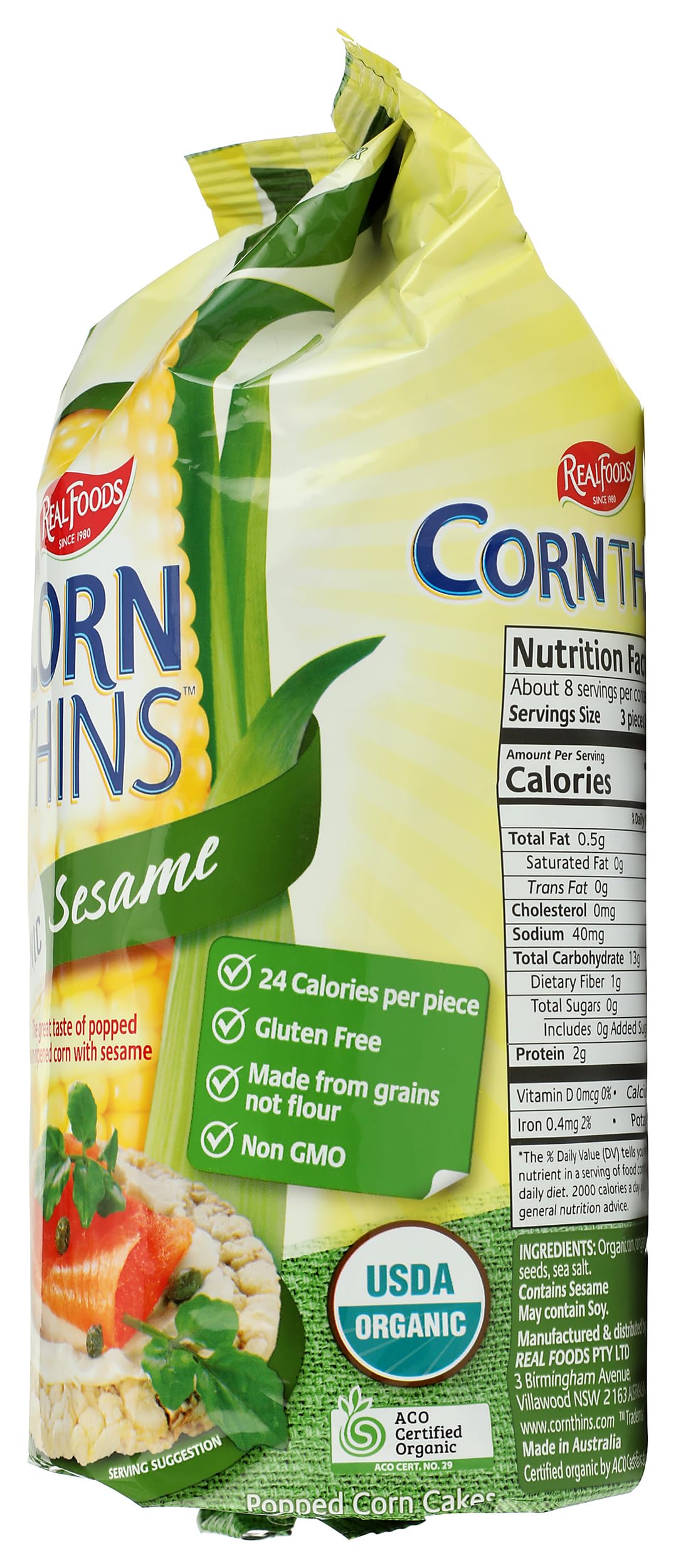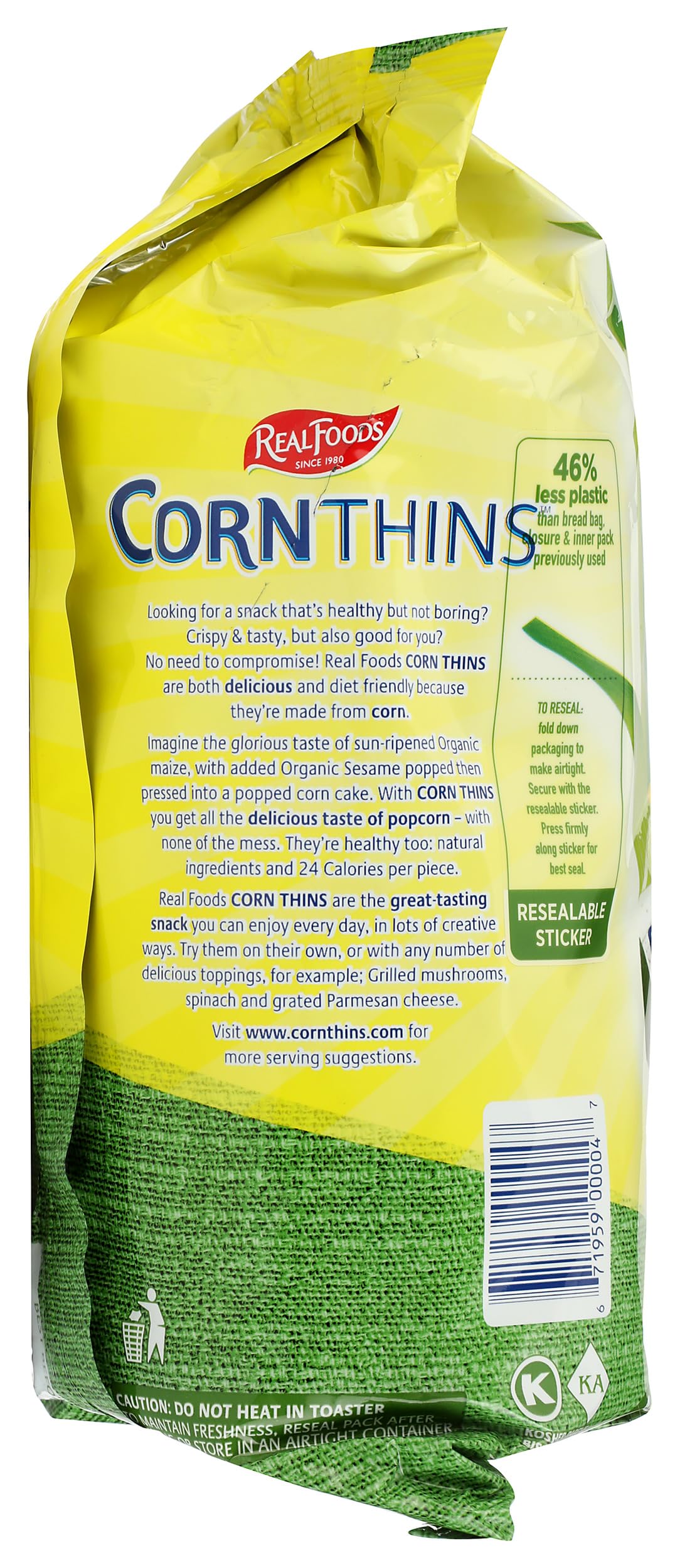 Real Foods Sesame Corn Thins are the best tasting wholegrain popped corn cakes you can buy Made with a great recipe for maximum crunch and flavor, they taste sensational on their own or with any number of delicious toppings Our Sesame Corn Thins are made simply by popping organic grains of corn, with added sesame seeds, under high temperature Being fat free and all natural, Real Foods Corn Thins really are good for you