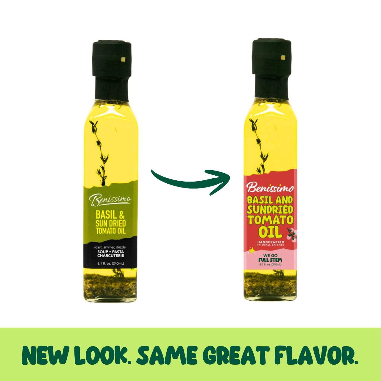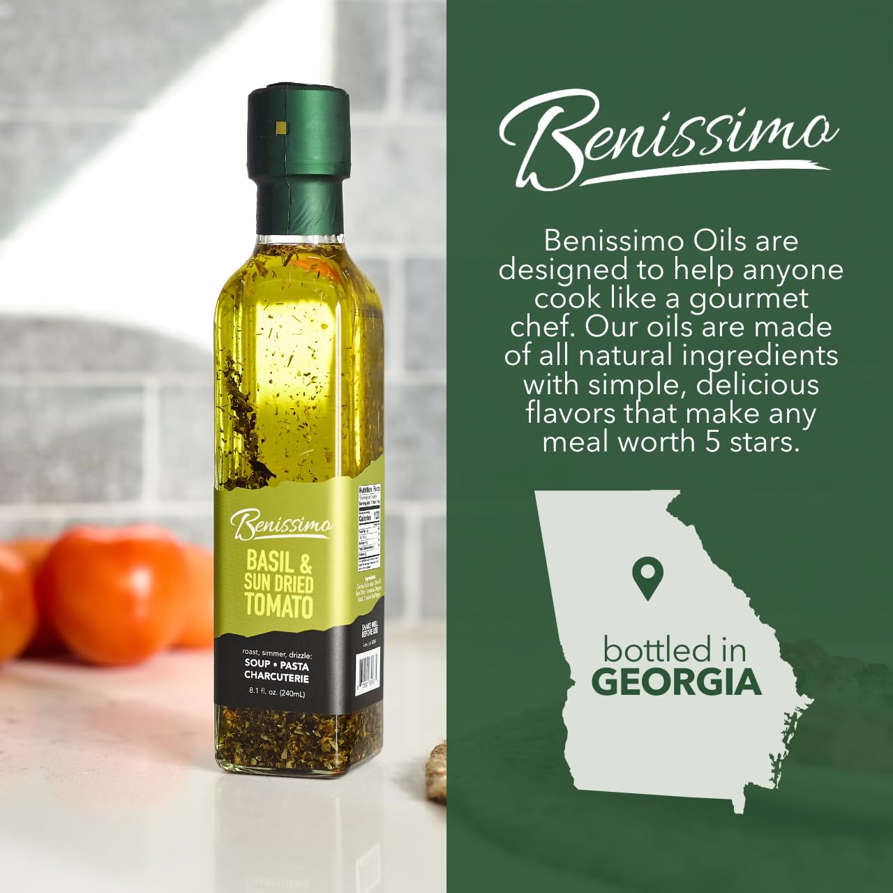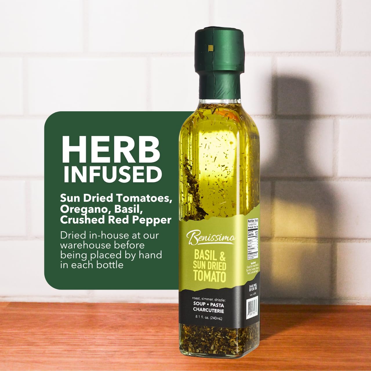 Benissimo Basil and Sun Dried Tomato Herb Infused Oil, All Natural Gourmet Cooking Oil with Garden-Fresh Herbs, Ideal for Dipping, Sautéing, Drizzling, 8.1 fl oz