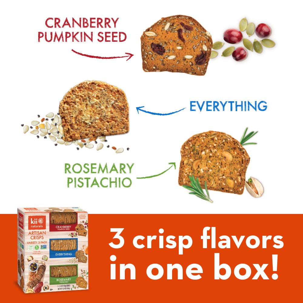 Kii Naturals Artisan Crisps, Healthy Snack Crackers for Cheese, Meats, Spreads, Charcuterie Board - Non-GMO, Kosher, No Preservatives, Hand-Crafted - Variety Pack, 5.3 Ounce (Pack of 3)