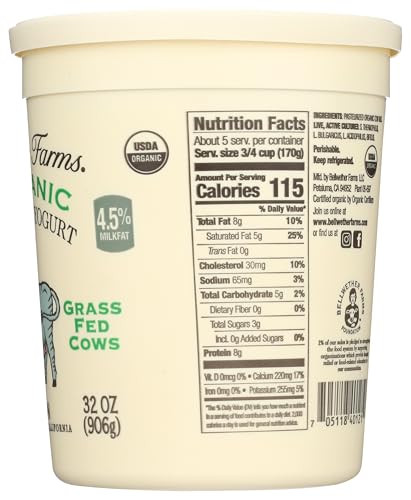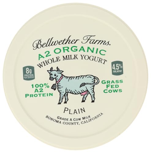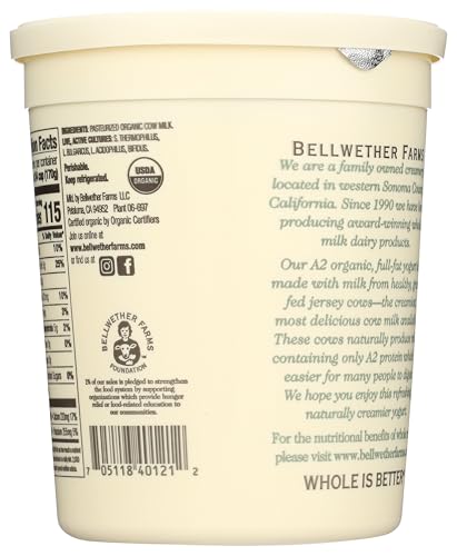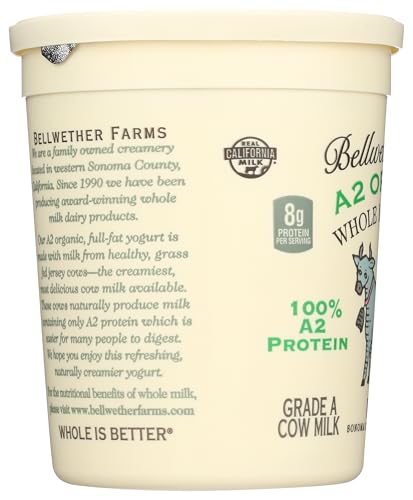 8 g protein per serving. 100% A2 protein. USDA Organic. Certified organic by organic certifiers. 1.5% milkfat. Grass fed cows. We are a family owned creamery located in western Sonoma County, California. Since 1990 we have been producing award-winning whole milk dairy products. Our a2 organic, full-fat yogurt is made with milk from healthy, grass-fed jersey cows-the creamiest, most delicious cow milk available. These cows naturally produce milk containing only a2 protein which is easier for many people to digest. We hope you enjoy this refreshing, naturally creamier yogurt. For the nutritional benefits of whole milk, please visit www.Bellwetherfarms.Com. Grade A. www.bellwetherfarms.com. Join us online at www.bellwetherfarms.com or find us at Instagram. Facebook. Bellwether Farms Foundation: 1% of our sales is pledged to strengthen the food system by supporting organizations which provide hunger relief or food-related education to our communities. Sonoma county, California.