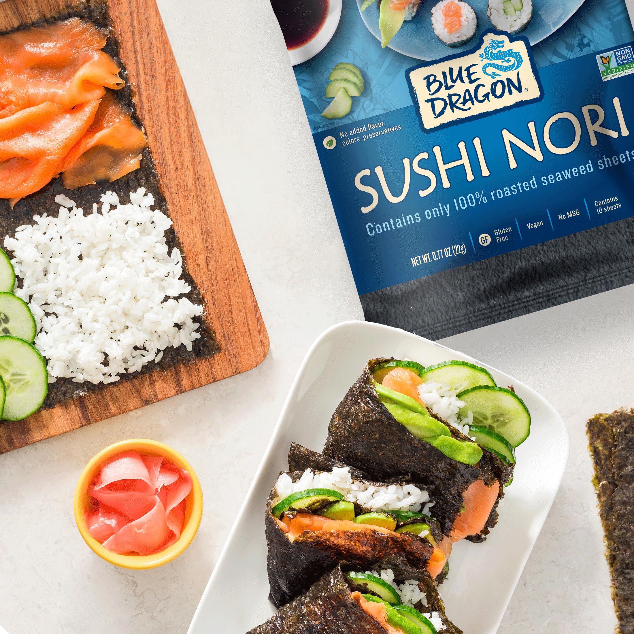Blue Dragon Sushi Nori make it easy to make Sushi Rolls at home! Blue Dragon Sushi Nori is classic roasted seaweed sheets with natural umami flavor, ideal for making this delicious Japanese classic. There are easy to follow instructions for classic sushi rolls right on the pack. Blue Dragon Sushi Nori is also delicious as a salad topping, in a poke bowl or even can be filled easily and quickly to make a sushi taco with rice and your favorite fillings! No added flavors, colors or preservatives, gluten free, vegan, and NON GMO verified.