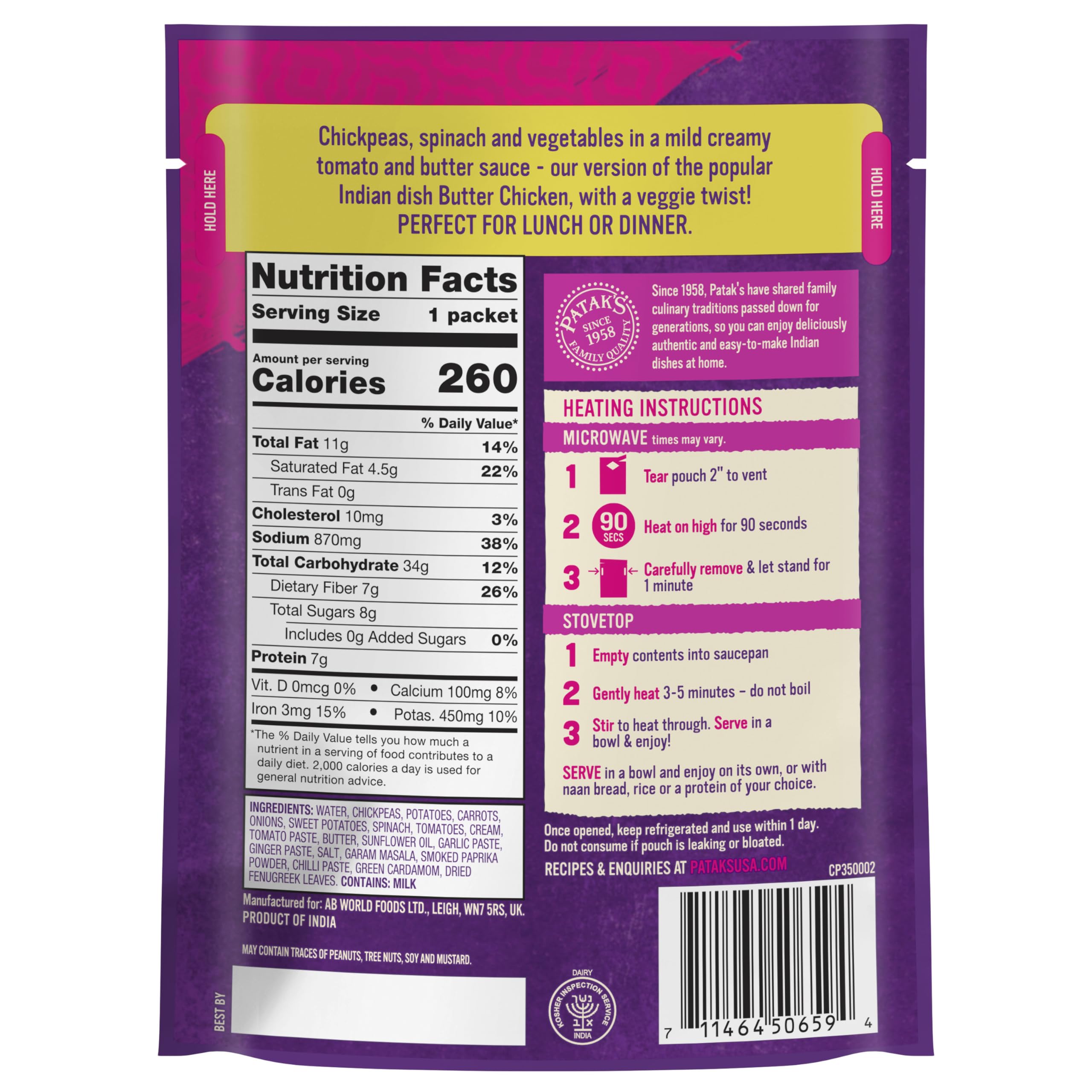 PATAK'S Butter Chickpeas & Veggies is a vegetarian twist on a traditional Butter Chicken dish. This flavorful, mild curry is made with chickpeas, spinach, carrots, and a balanced melody of other veggies. Perfect as a quick meal or delicious side; great as an individual serving or can be shared. Simply heat, eat, and enjoy on its own, with naan bread, or rice. No Artificial Flavors, Colors or Preservatives, made with NON-GMO Ingredients, BPA Free Pouch, Kosher Dairy. Suitable for Vegetarians. Comes in 2 other delicious varieties: Lentil Tikka Masala with lentils, beans, pumpkin & red pepper, and Chickpea Korma with green beans & cauliflower.