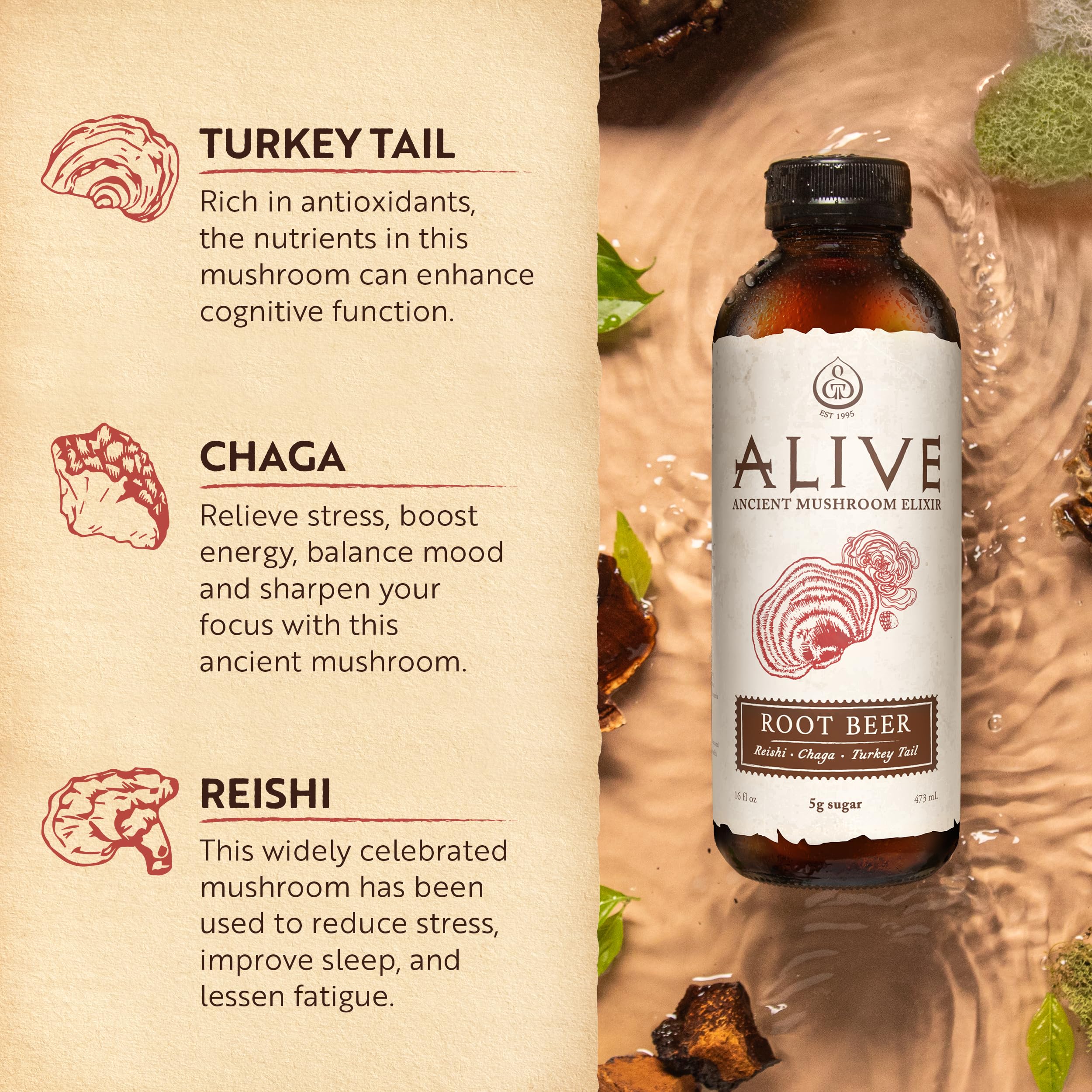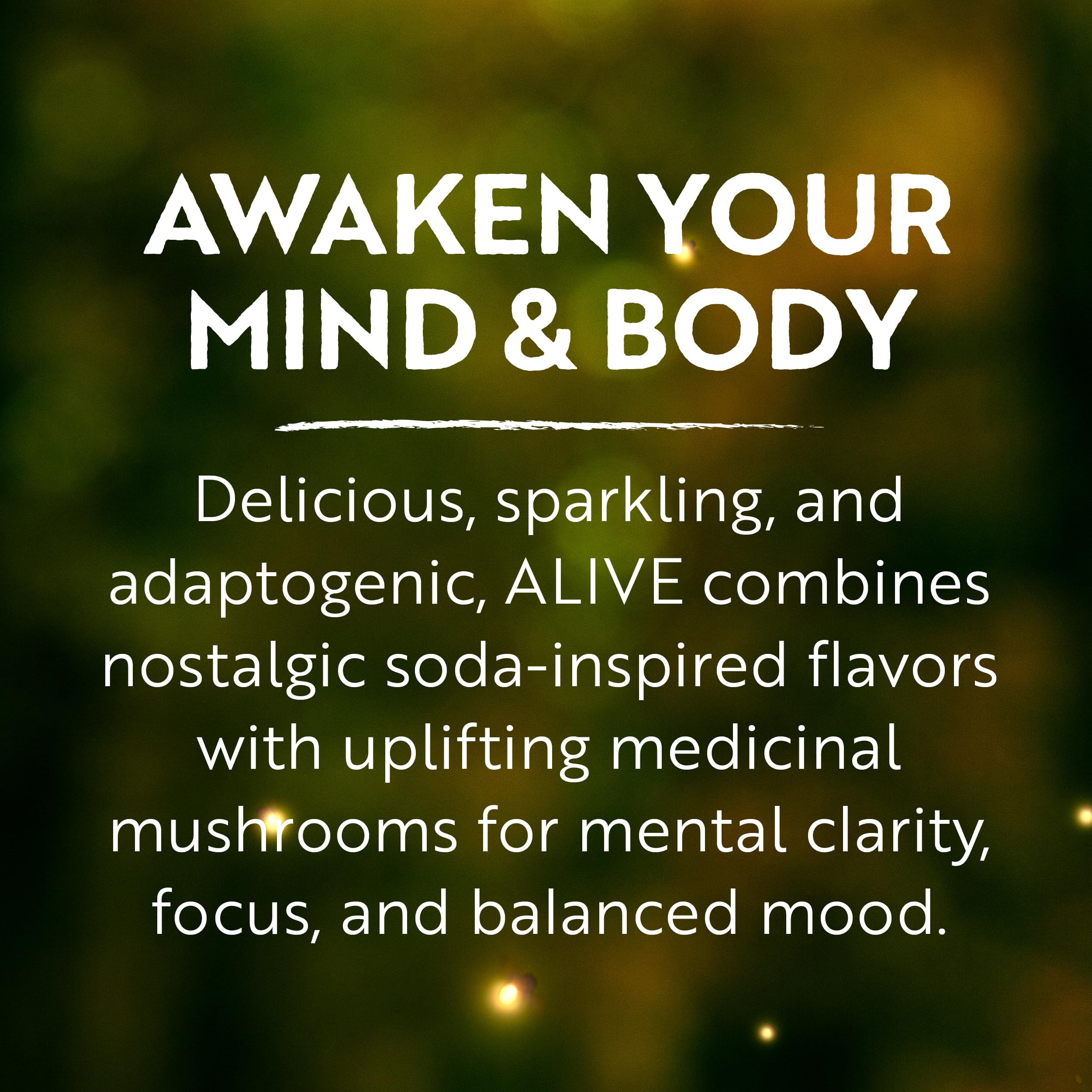 Elevate your day and feel ALIVE. ALIVE Root Beer revives your mind and body with the nostalgic flavor of root beer, made better for you. This sparkling adaptogenic beverage is designed to naturally energize your body and mind, making it a great substitute for energy drinks, sugary sodas, tea, and coffee. Made with three uplifting medicinal mushrooms, each delicious sip offers mental clarity, focus, and balanced mood so you can feel alert, awake, and, more importantly, ALIVE. Since 1995, GT's Living Foods has been crafting functional recipes inspired by nature's healing properties. The family-owned and operated company has created a diverse portfolio of delicious and efficacious living foods for the living body. Each is made with the same unwavering commitment to real function and real benefits as ALIVE.