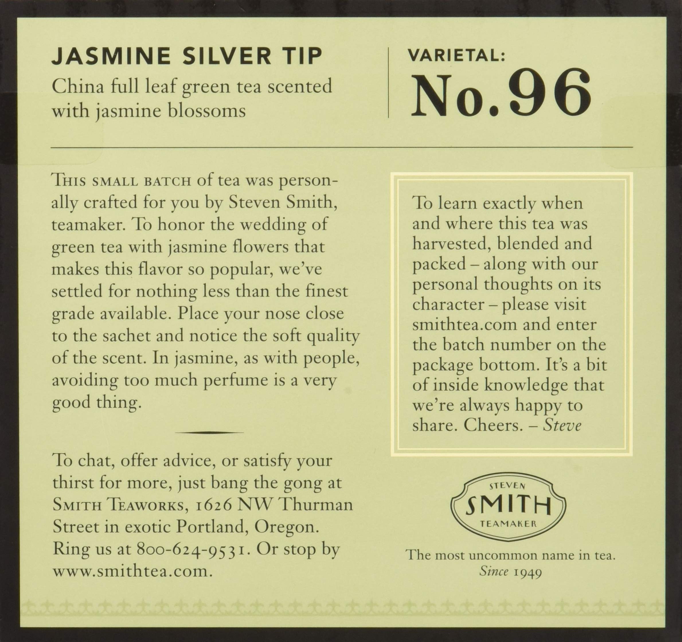 Smith Teamaker Jasmine Silver Tip Green Tea (Pack of 6 - 15 Bag Each)